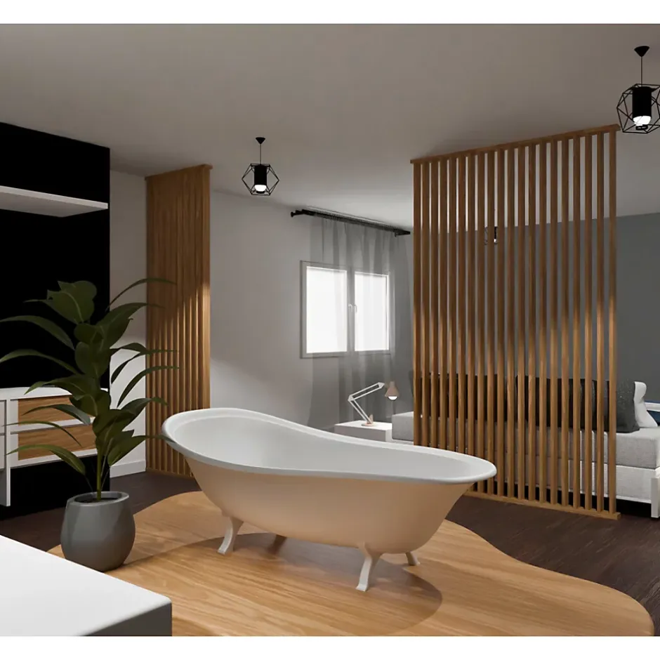 - Installation et recommandations : – Pour une stabilité optimale, il est recommandé d’opter pour une fixation fixe au sol et au plafond (fixations non fournies). Une fixation définitive adaptée au support est indispensable pour assurer une installation sécurisée.- Le bois est un matériau vivant et peut réagir aux variations d’humidité et de température, entraînant de légères déformations avec le temps.-Livré poncé, il peut être installé sans finition. Toutefois, nous conseillons d’appliquer une huile ou un vernis adapté pour protéger le bois contre les projections d’eau et assurer sa longévité.