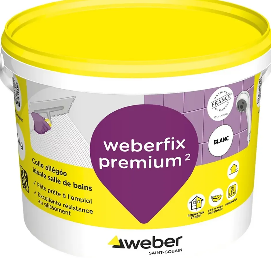 Adhésif hautes performances- Pâte prête à l’emploi- Moins de pénibilité : seau de 17kg équivalent à 25kg d’un adhésif traditionnel- Haute résistance à l’humidité idéale pour les pièces humides et la salle de bain- Application facile grpace à sa texture onctueuse- Collage direct sur ancien carrelage ou peinture Domaine d’utilisation :- Pose de carrelages et pierres naturelles, de formats 33×33 cm maxi, sur supports muraux intérieurs, sur paillasses, tables ou plans de travail,- Collage sur ancien carrelage et peinture,- Résistant à l’humidité (salles de bains, douches, cuisine?). Ne pas utiliser :- sur sols intérieurs ou extérieurs,- dans des locaux très humides (piscines..),- avec des carreaux de très grands formats- pour la pose de carreaux de porosité réduite sur support non absorbant (exemple : émaux sur carreaux de grès) ; dans ce cas, weberfix premium ² sécherait lentement, l’eau contenue dans l’adhesif s’éliminant difficilement- sur métal et sur supports en mauvais état- sur murs recouverts d’un ragréage pelliculaire (inférieur à 3 mm) Supports compatibles : Béton, Enduit ciment ou chaux ciment, Plaque de plâtre cartonnée hydrofugée (bleu), Plâtre (blanc), Plaque de plâtre cartonnée hydrofugée (verte), Enduit plâtre, Panneaux polystyrène prêts à carreler, Panneaux de bois CTBX CTBH OSB, Carrelage, Peinture sur plâtre, Peinture sur ciment, Rt3 (parpaing, béton…)<