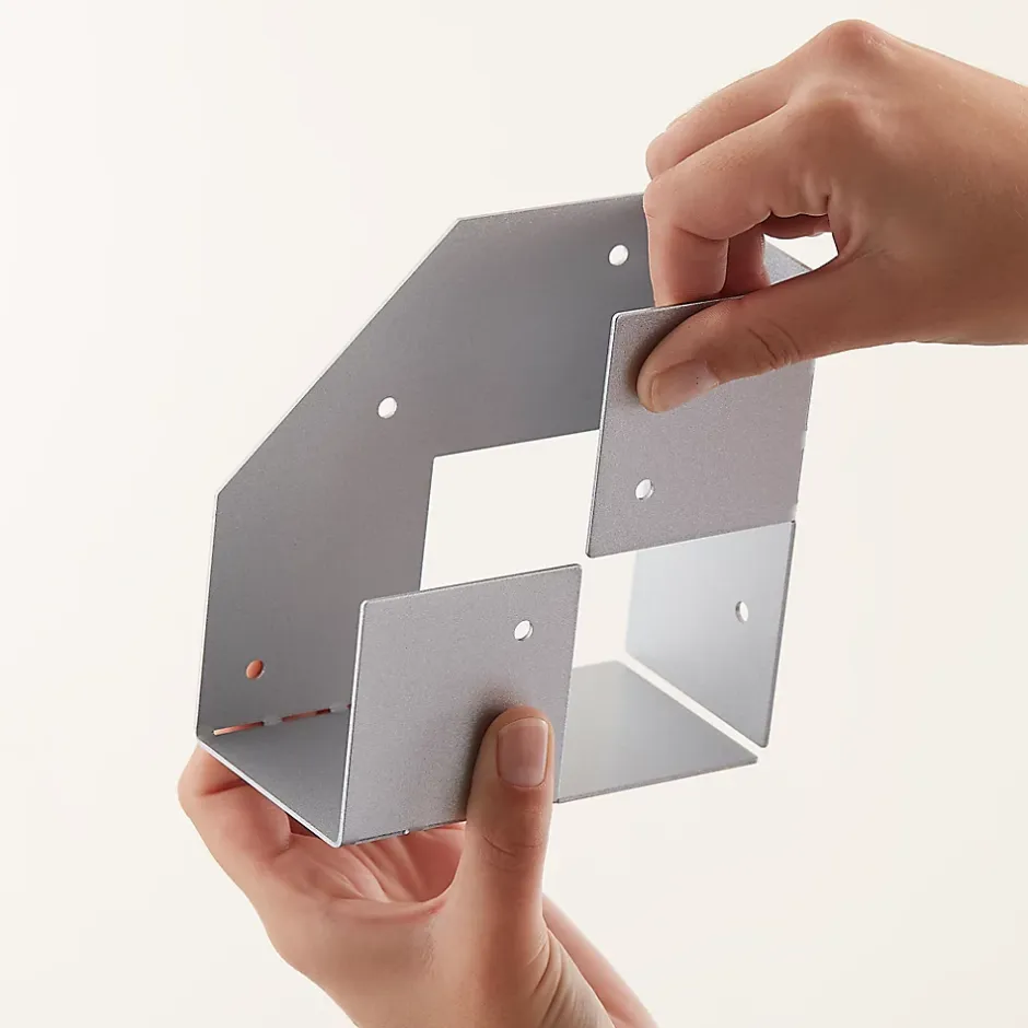 - Pliez le connecteur le long des lignes perforées, insérez l’élément en bois dans le connecteur et fixez-le avec des vis