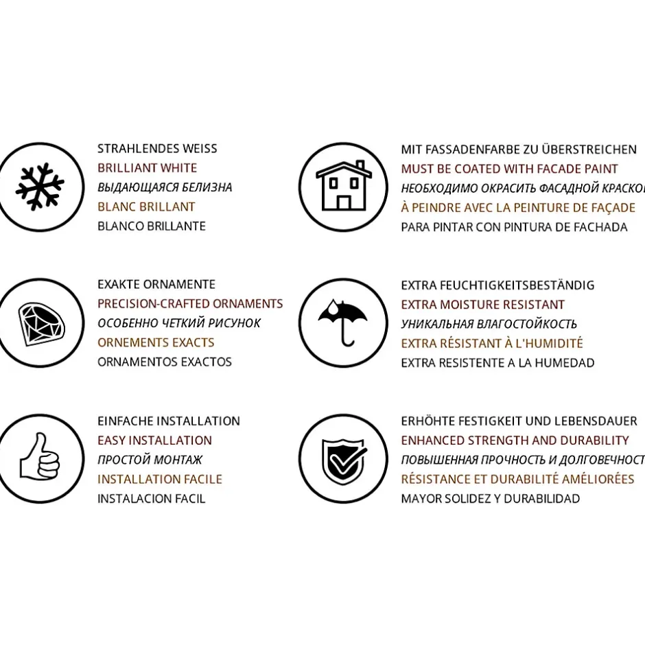 Numéro d’article 431302 Type de produit Corniche Fabricant Profhome Decor Pays / région de production Allemagne Collection Profhome Modèle no. Profhome | 431302 Matériau Mousse de polyuréthane rigide Version pas flexible Longueur (cm) 200 Largeur (cm) 25.7 Hauteur (cm) 20 Couleur de base blanc Style intemporel / classique Combinable avec 431332, 431322, 431312, 438301 Adhésif approprié G06M290 (intérieurs), G10U290 (extérieurs / pièces humides), G08S60 oder G07S290 (joints) Propriétés du matériau léger, solide, indéformable Approprié pour extérieurs