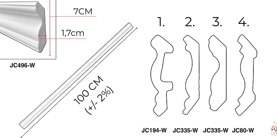 Materiau PS de haute qualite : Fabriquees en materiau PS robuste et resistant aux chocs, les moulures sont durables, stables, impermeables et peuvent etre peintes. Ideales pour la decoration des murs et des plafonds dans les pieces de vie, couloirs, chambres ou bureaux.Dimensions precises et bords nets : Chaque moulure mesure 100 cm de long (+/- 2 %), avec des bords de profil bien definis pour des raccords parfaits. Disponibles en quatre designs elegants – du classique au moderne – pour une decoration personnalisee.Montage facile sans percer : Les moulures se collent simplement avec un adhesif de montage – sans vis ni clous. Parfait pour les bricoleurs – rapide, propre et durablement esthetique.Decoupables et adaptables : Les moulures en PS se decoupent facilement avec une scie a onglets ou une petite scie manuelle. Pour les angles – interieurs ou exterieurs – une coupe a 45 degres est recommandee pour des raccords parfaits.Faciles a entretenir et durables : Grace a leur surface impermeable, ces moulures conviennent egalement pour les cuisines et salles de bain. Le materiau est stable en couleur, resistant a la temperature et facile a nettoyer – ideal pour une decoration durable et impeccable.