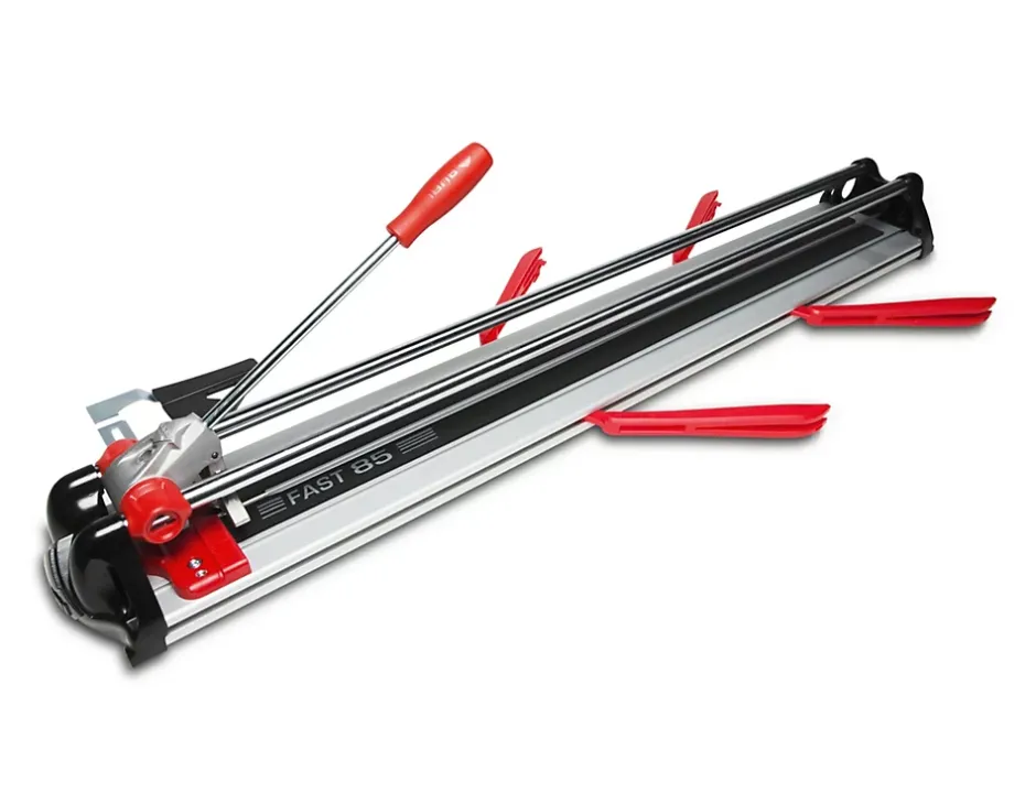Les coupeuses manuelles FAST sont équipées d’un séparateur mobile qui est plus rigide et stable, ce qui facilite le traçage des matériaux à couper. Les coulisses de POM fournissent une grande rigidité et une précision élevée dans le traçage tout en réduisant le frottement avec les guides. Les guides en acier sont calibrés, rectifiés et chromés pour assurer une durabilité maximale et garantir la précision et la stabilité dimensionnelle. Ces guides ont un diamètre de 18 mm, ce qui favorise une résistance à la torsion lors du traçage et de la coupe de carreaux céramiques. Il y a deux modèles disponibles, avec des capacités de coupe de 65 cm ou 85 cm. Les coupeuses incluent également quatre supports latéraux qui peuvent être ajustés à la position du carreau céramique pour offrir une fixation et une stabilité supérieures, en particulier pour les grands formats. Les coupeuses sont livrées avec une molette interchangeable RUBI de 6 ; les autres vendus séparément sont du 8 et 10 mm de diamètre pour obtenir les meilleurs résultats sur les matériaux céramiques. Tous les modèles de la série FAST sont équipés d’une butée latérale avec une équerre à 45° pour réaliser des coupes répétitives et en diagonale de manière simple et rapide.