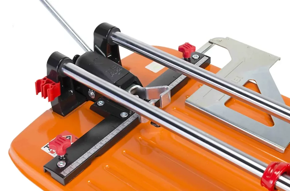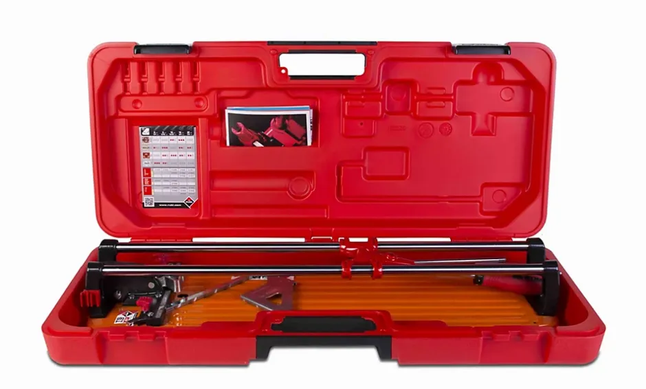 – Coupeuse manuelle pour carrelage TS MAX – Matière: acier- Coloris: orange- Forme: rectangulaire- Machine pour couper le carrelage- Existe en différents modèles pour s’adapter au différentes tailles de carreaux- Malette pour le transport avec fermoirs et charnières renforcés pour faciliter le transport et protéger nos coupes carreaux- Facile à transporter- Facile à utiliser sur les chantiers- Outillage professionnel simple d’utilisation et très fonctionnels Les coupes carreaux manuels TS-MAX RUBI sont recommandés pour la coupe intensive de céramique en général, grès cérame et grès émaillé (type Bla) – intègrent un séparateur monopoint pratique et performant, avec une puissance de séparation maximale de 800 kg- spécialement conçu pour la coupe de matériaux durs d’une épaisseur maximale de 15 mm – Avec des poignées ergonomiques bi-matière pour un plus grand confort de travail- Avec une grande butée latérale pour un meilleur maintien du carreau et pour une plus grande précision dans les coupes répétitives – Base renforcée et large garantissant une bonne stabilité pendant la coupe- Equipé de 2 guides en acier chromé, rectifiés, calibrés et avec traitement anti-corrosion pour une meilleure visibilité de la ligne de coupe- Permet de garantir une grande précision lors de chaque coupe – Robuste- Fiable Dimensions et poids: – Hauteur: 135 mm – Largeur: 354 mm pour les modèles TS-43 et TS-57 ou 45 mm pour les mod&egra