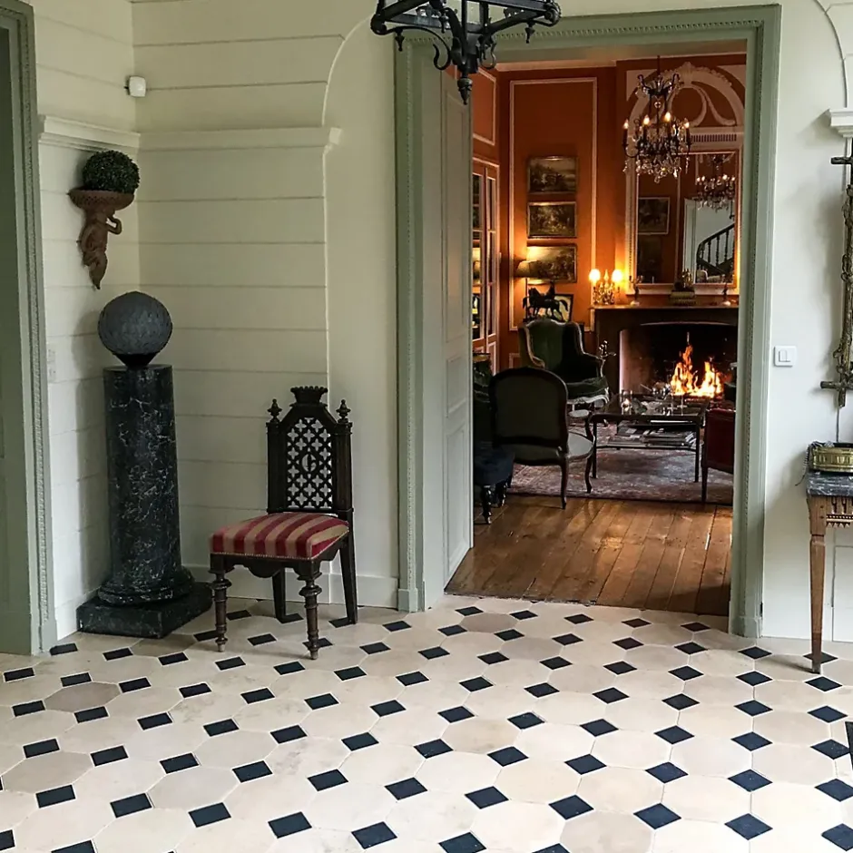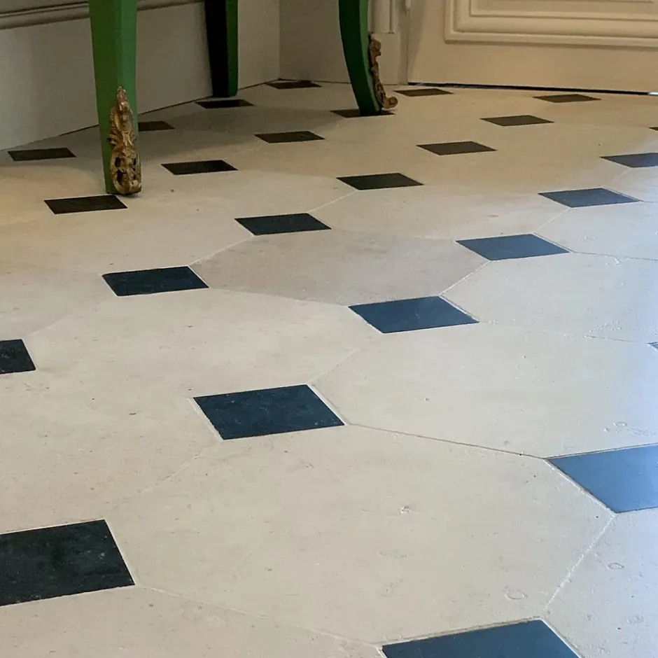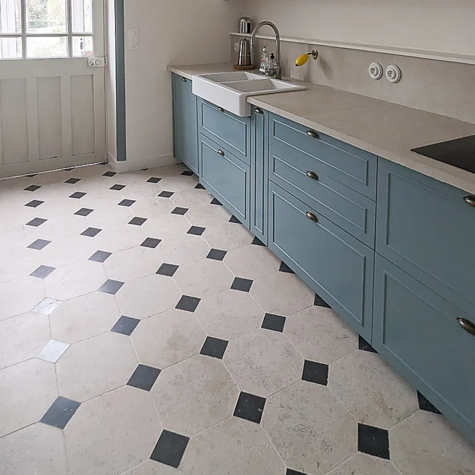 Les avantages de ce dallage à cabochons en pierre du NivernaisCe dallage à cabochons en pierre naturelle apporte un cachet authentique et élégant à votre intérieur. Fabriqué en France à partir de pierre du Nivernais, il séduit par la richesse de ses nuances naturelles et par le contraste raffiné entre les dalles claires et les cabochons en pierre bleue.Sa finition adoucie, douce au toucher, offre un rendu sobre et intemporel, parfaitement adapté aussi bien aux intérieurs classiques qu’aux ambiances contemporaines. Grâce à ses bords droits, la pose est régulière et assure un résultat soigné et harmonieux.Conçu pour durer, ce dallage en pierre naturelle est compatible avec le chauffage au sol, résistant au gel et idéal pour les pièces de vie telles que le salon, l’entrée, la cuisine ou la chambre. Chaque dalle étant unique, de légères variations de teinte et de texture peuvent apparaître, renforçant le caractère naturel et le charme du produit.