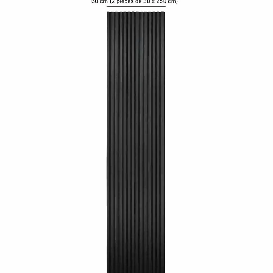 Découvrez le panneau bois dans sa décoration la plus radicale avec le tasseau noir sur feutrine noire. Un ton sur ton qui renforcera le caractère et la modernité de votre décoration intérieure.Ce panneau en tasseaux de bois noir est idéal pour intégrer en toute discrétion votre écran TV ou, à l’inverse, jouer le contraste avec les meubles de la pièce qui les accueillera.Adaptés aux murs comme aux plafonds, ces panneaux de lattes de bois sur feutrine en polyester sont également d’excellents alliés pour améliorer considérablement l’acoustique et l’insonorisation de votre pièce.Présentation du panneau mur tasseau bois noirCe panneau en tasseaux noirs mesure 250 cm de hauteur pour 30 cm de largeur. L’épaisseur totale est de 19 mm. Il est constituée d’un support en feutrine de polyester noire sur lequel sont agrafés les tasseaux noirs en MDF. Chaque latte présente une section de 27 mm x 11 mm. Ils sont écartés de 16 mm.Avantages du tasseau noir- Avec sa finition noire, le panneau tasseau bois revêt sa version la plus contemporaine.- Tout en empruntant une finition ton sur ton, ce panneau décoratif révèle un effet 3D intéressant entre les lamelles satinées et la feutrine extra mate.- Facile à poser, ces panneaux peuvent être vissés ou collés.- Leur conception intelligente vous permet une pose sans raccord visible.- Grâce à leur structure en relief, ce revêtement mural améliore l’acoustique de votre pièce en atténuant la réverbération du son sur les murs.- La feutrine de haute qualité atténue également les sons provenant de l’extérieur.