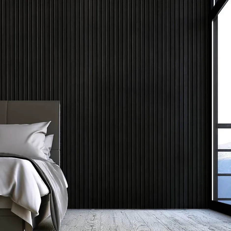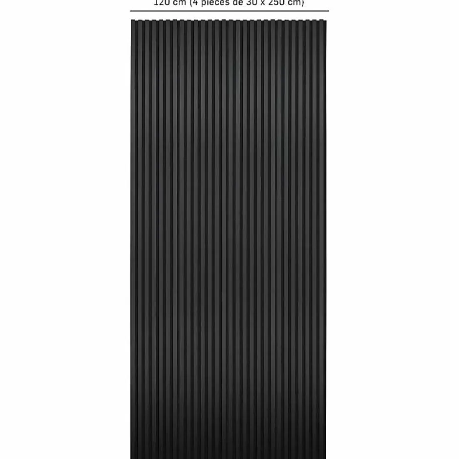 Découvrez le panneau bois dans sa décoration la plus radicale avec le tasseau noir sur feutrine noire. Un ton sur ton qui renforcera le caractère et la modernité de votre décoration intérieure.Ce panneau en tasseaux de bois noir est idéal pour intégrer en toute discrétion votre écran TV ou, à l’inverse, jouer le contraste avec les meubles de la pièce qui les accueillera.Adaptés aux murs comme aux plafonds, ces panneaux de lattes de bois sur feutrine en polyester sont également d’excellents alliés pour améliorer considérablement l’acoustique et l’insonorisation de votre pièce.Présentation du panneau mur tasseau bois noirCe panneau en tasseaux noirs mesure 250 cm de hauteur pour 30 cm de largeur. L’épaisseur totale est de 20 mm. Il est constituée d’un support en feutrine de polyester noire sur lequel sont agrafés les tasseaux noirs en MDF. Chaque latte présente une section de 27 mm x 11 mm. Ils sont écartés de 16 mm.Avantages du tasseau noir- Avec sa finition noire, le panneau tasseau bois revêt sa version la plus contemporaine.- Tout en empruntant une finition ton sur ton, ce panneau décoratif révèle un effet 3D intéressant entre les lamelles satinées et la feutrine extra mate.- Facile à poser, ces panneaux peuvent être vissés ou collés.- Leur conception intelligente vous permet une pose sans raccord visible.- Grâce à leur structure en relief, ce revêtement mural améliore l’acoustique de votre pièce en atténuant la réverbération du son sur les murs.- La feutrine de haute qualité atténue également les sons provenant de l’extérieur.Pack de 4 pièces – Pour concevoir un Mur tasseaux bois de 3m2 (120 x 250 cm)Decoon vous propose une solution tout-en-un</str