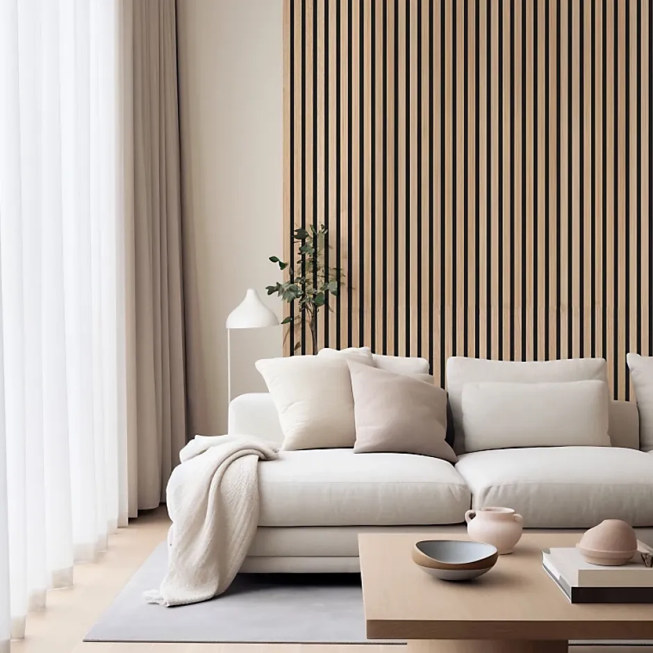 Vous souhaitez créer un espace aux touches naturelles tout en améliorant l’acoustique de votre pièce ? Découvrez la nouvelle tendance déco des lamelles en bois sur feutrine ! Les panneaux remplissent 2 fonctions :ils décorent une pièce très facilement et habillent de façon moderne et chaleureuse un mur nu.Ils atténuent le bruit ambiant des pièces grâce à des matériaux insonorisants. Plutôt pas mal pour un bureau ou un mur TV !Parfait pour les agenceurs, les amoureux de la décoration intérieure, les professionnels de l’aménagement, les architectes : ce produit sera votre allié pour rénover avec facilité un intérieur en lui apportant une réelle touche de modernité.Nous proposons ce panneau décoratif chêne clair d’épaisseur 2 cm en dimensions 250 x 30 cm, 60 x 30 cm et 30 x 30 cm.Présentation du panneaux en tasseaux de boisDe dimensions de 250 x 30 cm ce panneau en tasseaux décoratif est composé d’une feutrine noire en polyester sur laquelle sont agrafés des lattes de bois de 11 mm d’épaisseur. L’épaisseur totale du panneau, feutrine incluse, est de 19 mm.Les tasseaux sont des lattes de MDF de section 11 x 27 mm, revêtues d’une couche de chêne clair véritable. Chaque tasseau est séparé du suivant par un écartement de 16 mm.Le décor imitation chêne du panneau lui donne un rendu plus vrai que nature, se mariant avec tous les styles de déco contemporaine, classique, moderne ou bohème !Pack de 5 pièces – Pour concevoir un Mur TV de 150 cm de longDecoon vous propose une solution tout-en-un, prête à poser, pour créer votre mur TV de dimension 250 x 150 cm (3,75m² de tasseaux) ! Pour réaliser vous même votre mur télévision insonorisé tout en décorant votre intérieur, les panneaux mur