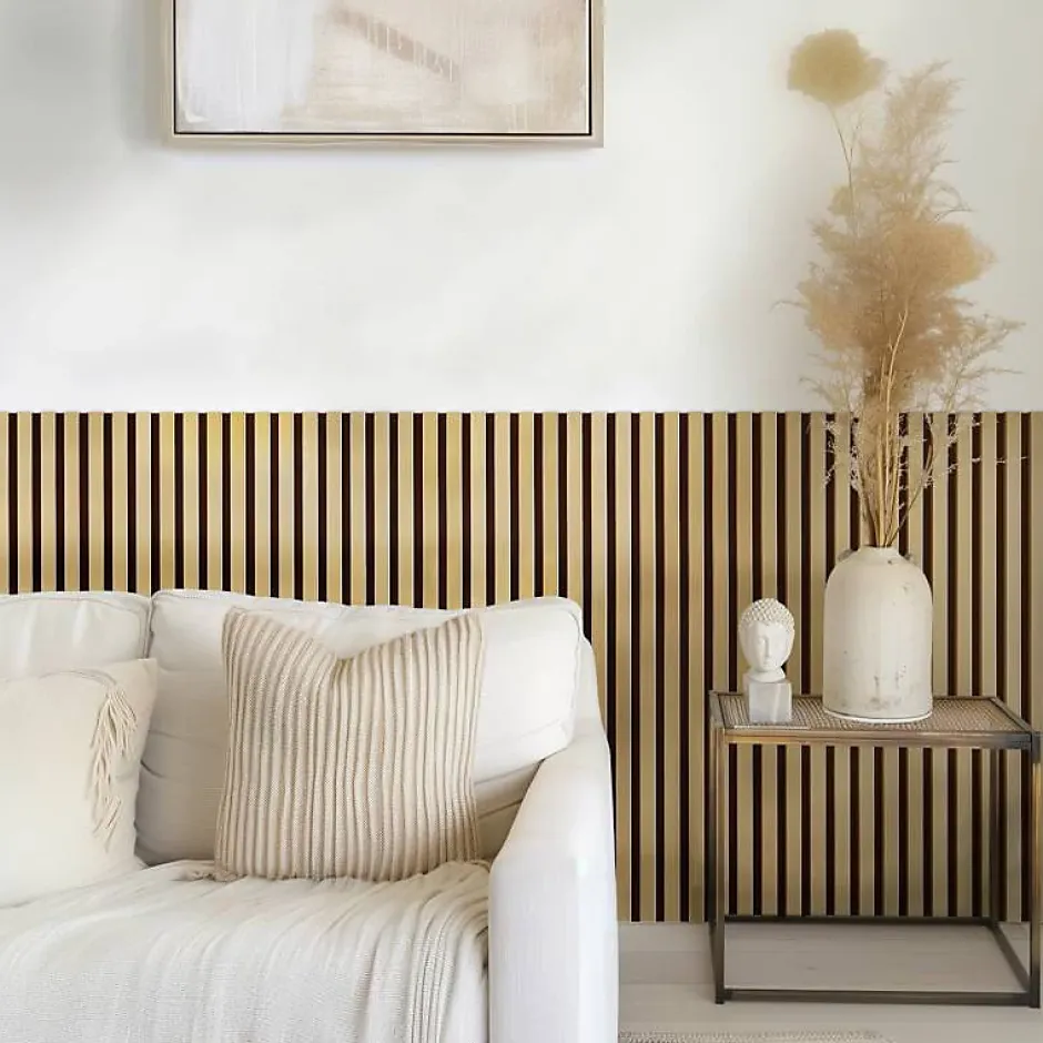 Adoptez l’élégance avec les panneaux tasseaux goldEnvie d’une décoration unique ? Nos panneaux tasseaux gold sont ce qu’il vous faut ! Modernes et ultra tendance, ils sont des décorations haut de gamme qui incarnent raffinement et chic à merveille. Laissez-vous transporter par leurs reflets dorés pour des ambiances lumineuses incomparables, tant en hiver qu’en été. Le contraste des couleurs et des matières est pensé pour un design de luxe et raffiné.Tête de Lit Tasseaux Bois – Pack de 7 Panneaux pour Lit 160 cmApportez une touche moderne et naturelle à votre chambre avec cette tête de lit en panneaux tasseaux bois. Conçu pour un lit de 160 cm, ce pack se compose de 7 panneaux tasseaux d’une hauteur de 120 cm, offrant une largeur totale de 210 cm. Cela permet un débordement élégant de 25 cm de chaque côté du sommier, créant un effet encadrant raffiné.Adaptable à différentes largeurs de lit : Ce pack convient également pour un lit 140 cm ou 180 cm, avec un débordement ajusté selon la taille du sommier.Un design acoustique alliant confort et sophisticationUn mariage unique entre des tasseaux en MDF revêtus d’un décor doré et une couche de 8 mm de feutrine aux propriétés acoustiques pour un design élégant et sublime sous tous les angles. Par ailleurs, la feutrine est un matériau doux qui évoque la chaleur et contribue à une isolation phonique. Malléable, elle calfeutre les espaces pour devenir un allié esthétique et fonctionnel. Ce format de 120 centimètres est conçu pour réaliser de jolis soubassements ou une tête de lit sans effort et apporter de l’élégance à toutes vos pièces.<strong data-start= »116