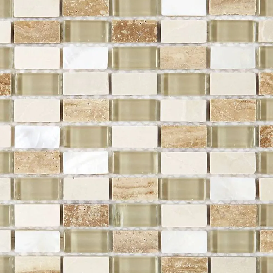 Composée de tesselles rectangulaires, la mosaïque s’adapte à tous les styles de décoration. Facile à poser, elle permet de laisser cours à sa créativité. Fabriquée en pierre et en verre de couleur beige, la plaque de mosaïque convient aux pièces sèches et humides. Idéale pour transformer son intérieur, elle s’utilise dans une salle de bains, une cuisine, un spa ou une entrée. Ajoutant du cachet à la décoration, le verre restitue la lumière et la pierre instaure une ambiance relaxante et naturelle.