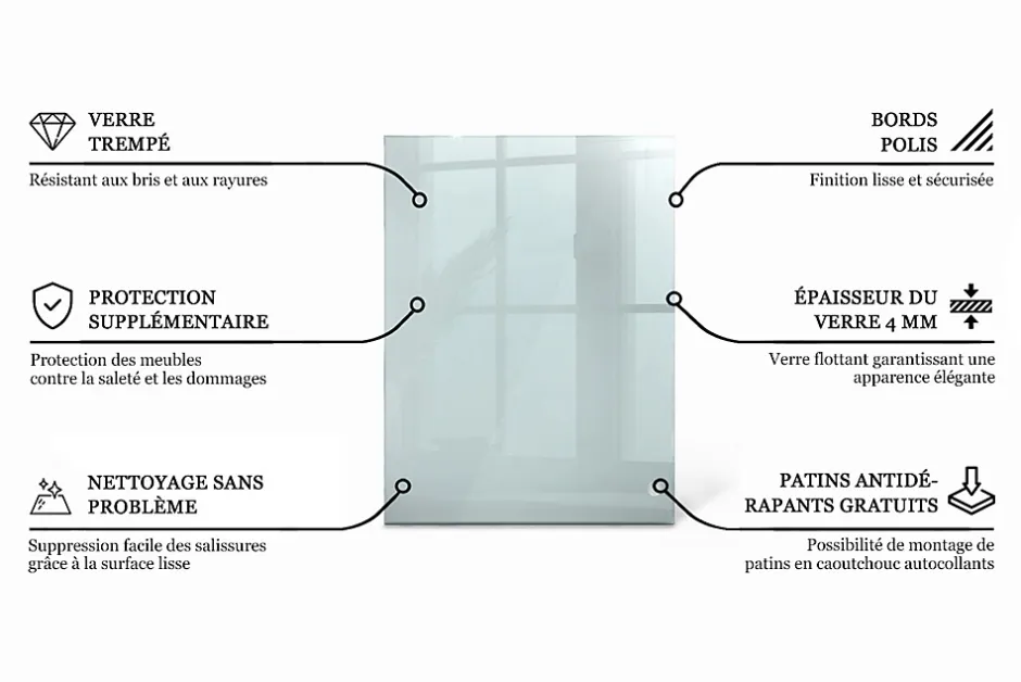 Le plateau de table en verre imprimé allie résistance et esthétique. Son verre trempé de haute qualité (float 4 mm) lui confère une solidité optimale face aux chocs et à la chaleur. L’impression intégrée au dos du verre donne de la profondeur et sublime vos espaces.Polyvalence d’usageIdéal pour les salles à manger, cuisines, salons, bureaux ou terrasses couvertes. Il se prête aussi bien à un usage quotidien qu’à une fonction purement décorative.Entretien sans effortLe verre ne retient ni traces ni humidité : un chiffon doux et humide suffit à lui redonner son éclat.Compatibilité universelleLe plateau s’intègre sur tout type de piètement – qu’il soit en bois, métal ou autre. Il n’a pas de fixations prépercées, ce qui permet une personnalisation libre de votre meuble.Formats variés disponiblesDisponibles en formats carrés, rectangulaires ou ronds – trouvez celui.