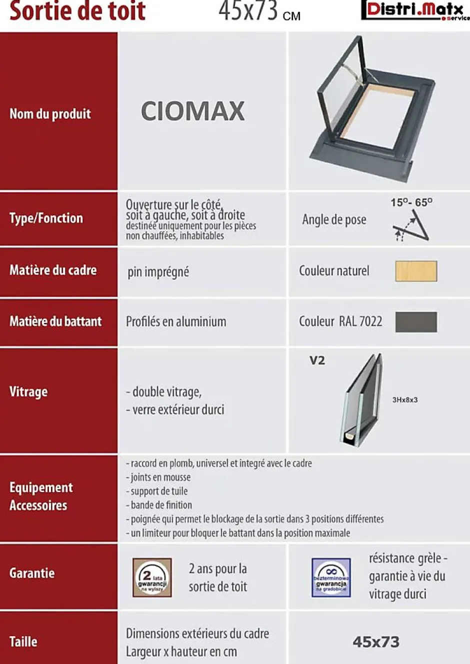 La pose de fenêtre de toit est une solution idéale pour l’éclairement des pièces sous toiture et permet également de ventiler occasionnellement les combles. Facile à poser la fenêtre est compatible avec tous modèles de tuile. Ces fenêtres ne sont pas recommandées dans les pièces habitables à cause de leur performance thermique. Le cadre en bois de pin et l’ouvrant double vitrage d’une épaisseur de 15 mm (3x8x3mm) est intégrés dans le profilé d’aluminium (verre extérieur durci). La fenêtre possède une jupe plomb collée à la base, il se maroufle facilement pour s’adapter au profil de la toiture. S’utilise sur une pente de toit allant de 15° à 65°. Ouverture soit à droite soit à gauche. La poignée permet le blocage de l’ouverture dans 3 positions différente. La fenêtre possède un limiteur pour bloquer le battant dans la position maximale•Matière du battant : profilés en aluminium couleur gris terre d’ombre (RAL 7016), jupe en plomb.•Matière du cadre : pin imprégné couleur naturel.•Verre extérieur durci, Double vitrage 3Hx8x3.•Dimension extérieure du cadre : 45 cm x 73 cm. Angle de pose de 15° à 65°.•S’adapte à toutes les tuiles et est livrée avec un raccord d’étanchéité. Facile à poser.