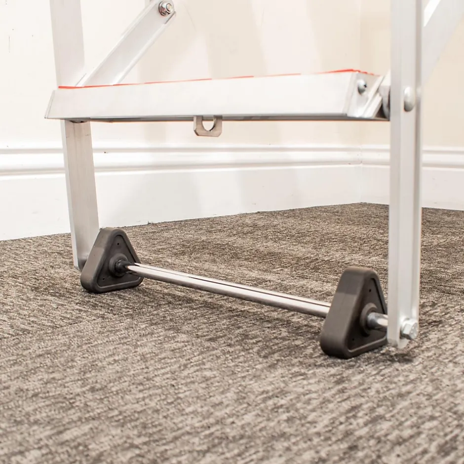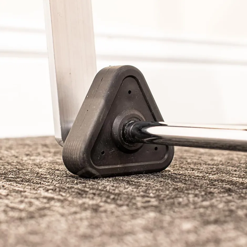 - Grands pieds triangulaires assurant une traction maximale sur tous types de sols et empêchant l’échelle de glisser, contrairement aux modèles à pieds circulaires