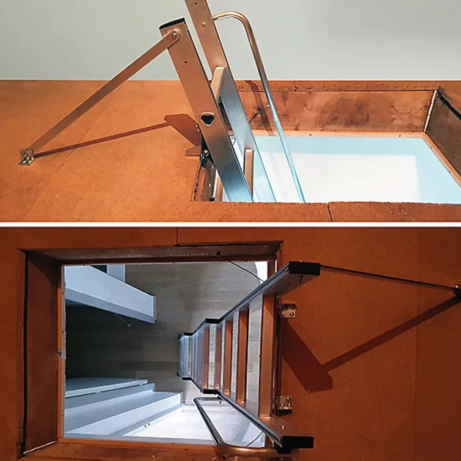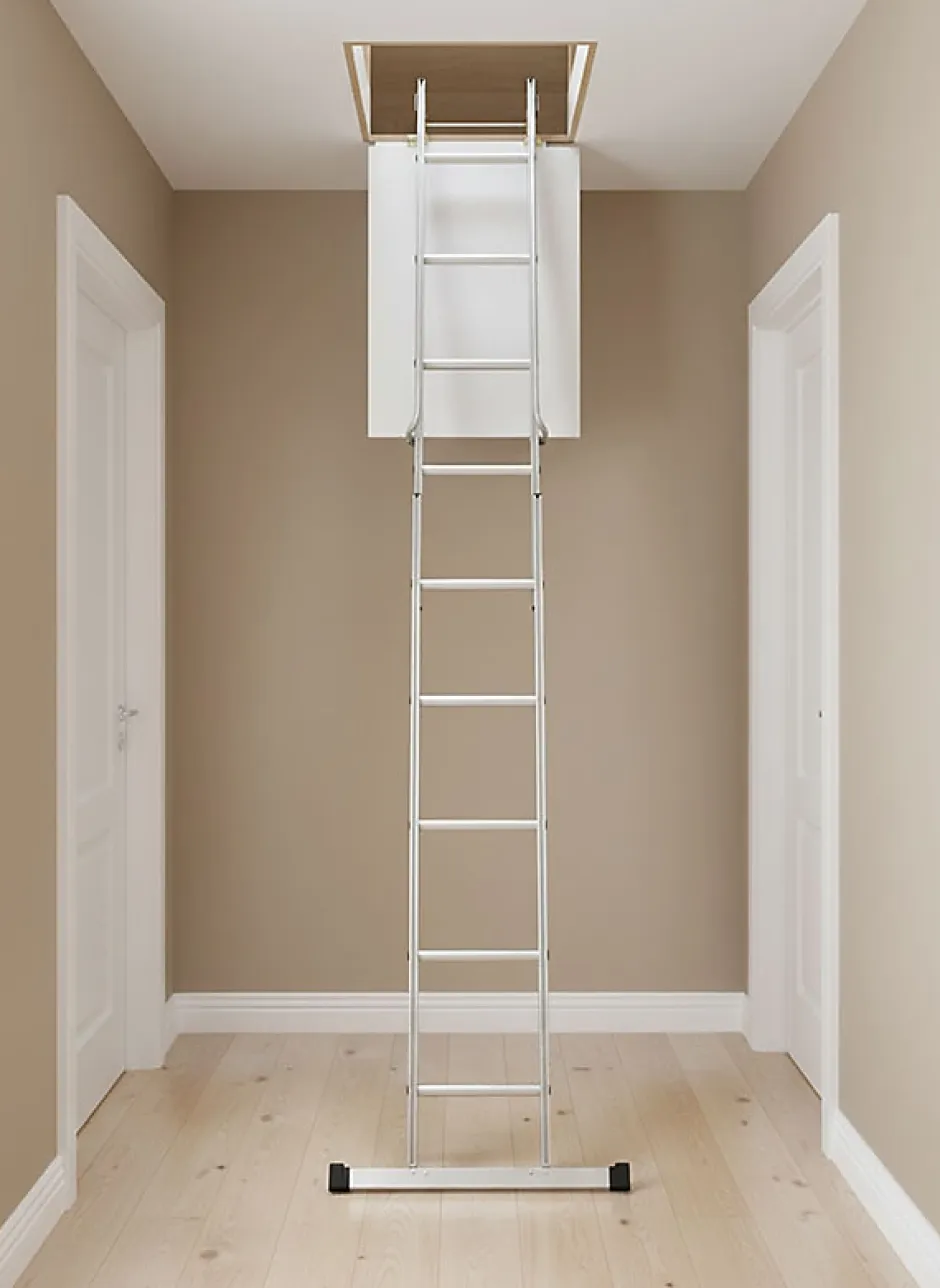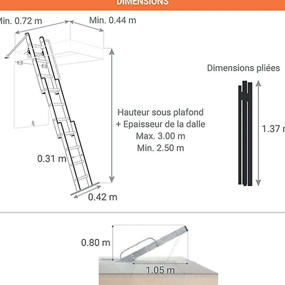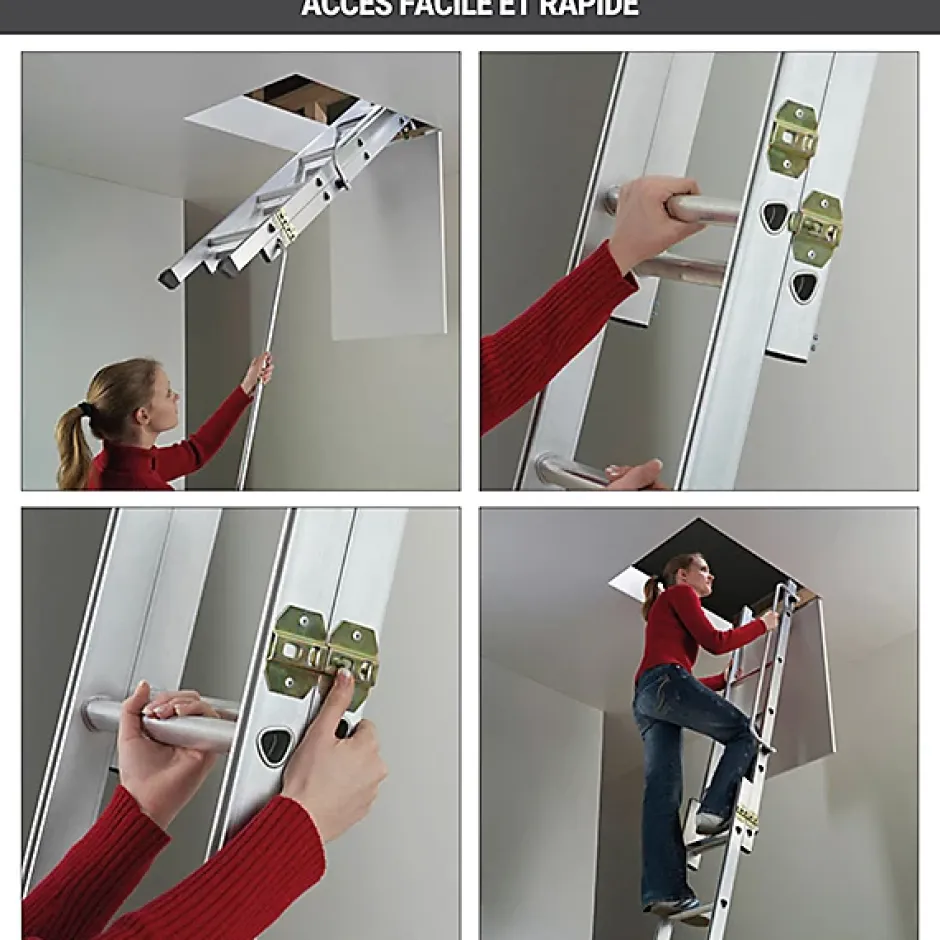 MATERIEL SANS TRAPPE- Echelle escamotable parfaite pour des travaux de rénovation.- Création de la trappe par vos soins en fonction de vos dimensions.- Pas besoin d’agrandir la dalle de votre plafond.ACCES AU GRENIER- Accès au grenier même lorsque l’ouverture au plafond est limitée- Accès possible même dans les petits espace comme les couloirsMANIPULATION SIMPLE- Echelle légère et peu encombrante facile à manipuler- Ouverture facile avec perche de manoeuvre fournie- Fermeture en faisant coulisser l’échelle à l’étage- Merci de vérifier que la place nécessaire soit disponible SECURITE- Echelons de 30 x 30 x 30mm- Echelons sûrs et confortables en forme triangulaire : surface de pose du pieds plane – Rampe d’accès pour la sécurité de l’utlisateur- Echelle escamotable coulissante de 3 plans de 4 barreaux chacun.MONTAGE FACILE- Installation rapide par un professionel ou par un bricoleur – Matériel livré avec notice de pose détaillée.Les accessoires et les options ne sont pas fournis avec le matériel, veuillez nous contacter pour plus de renseignements