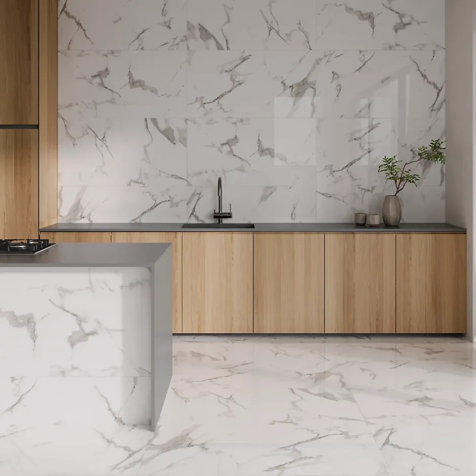 Carrelage sol et mur intérieur effet marbre blanc brillant L.120 x l.61 cm x ép.9 mm, Ecoceramic Aria