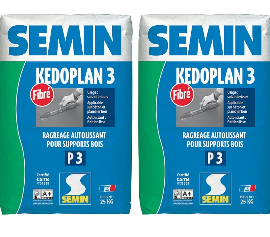 Enduit de ragréage autolissant pour la rénovation des planchers bois en sols intérieurs.Application en local sec, faiblement ou moyennement humide.Rattrapage des défauts de planéité et des irrégularités des supports.Ce pack contient :• Enduit de Ragréage Autolissant Kedoplan Fibré, 2 sascs de 25 kgCARACTÉRISTIQUES TECHNIQUESDensité : Poudre : 1,1Mortier durci : 1,8CONDITIONNEMENTSac de 25 kg.COMPOSITIONMortier à base de ciments, sable, résine, fibres synthétiques et divers adjuvants.La pâte obtenue est de couleur rouge et à fort pouvoir autolissant.SUPPORT ADMISBéton et chape ciment poreux, béton et chape ciment normalement poreux, béton et chape ciment fermés, chape sèche à base de ciment, chape anydrite (sulfate de calcium), chape sèche à base de plâtre et dérivés, chape asphalte, carrelage, dalles platiques semi flexibles, traces de colle acrylique, néoprène, bitumineuse ou époxydique, panneaux bois, parquet à lames.STOCKAGESe conserve 12 mois dans son emballage d’origine fermé, sans contact avec le sol, dans un local sec, tempéré et faiblement ventilé.TAUX DE GÂCHAGE5.8 à 6.2L d’eau par sac de 25kg.CONSOMMATION1,5 kg/m² et par mm d’épaisseur.