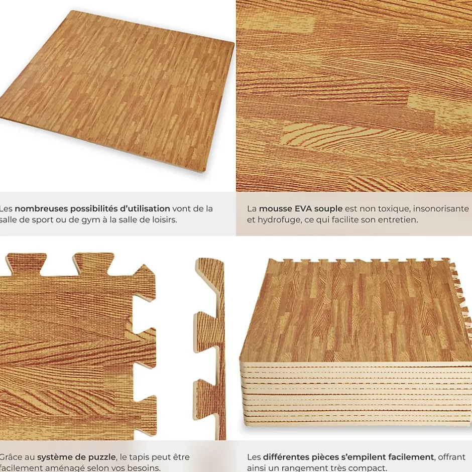 - Points Forts:Protège vos sols des rayures. Dalles individuelles assemblable au sol au moyen de bordures dentelées. Hydrofuge (Résistant à l’humidité). Isolant thermique. Isolant acoustique (Atténue le bruit). Surface rainurée antidérapante. Peut être ajusté selon vos besoins. Extrêmement Résistant. Nettoyage facile.