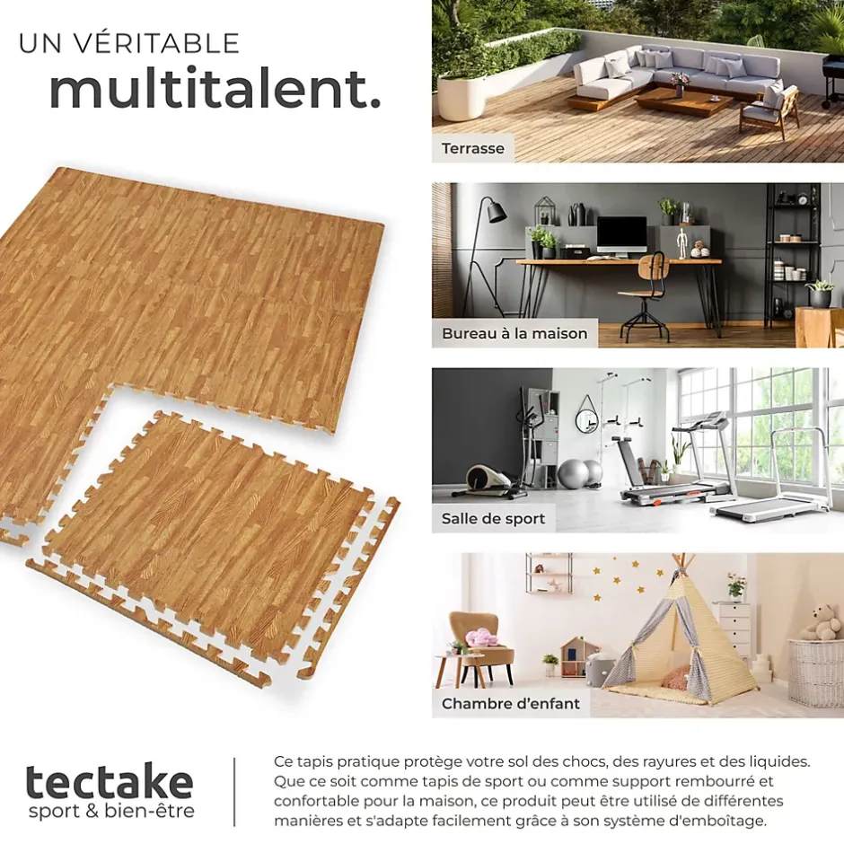 Ensemble de 12 Dalles Carrées EVA – Tapis de sol, Tapis de Sport, Tapis de Gymnastique, Tapis de Yoga, Tapis Puzzle Antidérapant en Mousse 61 cm X 61 cm TECTAKE. Vous recherchez un tapis de sol en mousse adaptable, fonctionnel, polyvalent et résistant. Ce tapis de sol épais composé de 12 pièces dentelées (Type Puzzle) protège vos sols selon vos différents besoins. Il est très résistant à l’usure et peut-être utilisé dans de nombreuses situations pour protéger, isoler vos sols. Dans une salle de sport, il protège efficacement vos sols contre les rayures des appareils de fitness ou de musculation. Il peut également servir comme tapis d’entrainement, de gymnastique, de sol ou de yoga et protège vos sols de la transpiration. Dans une buanderie ou dans une salle de bain, ce tapis de sol en mousse atténuera le bruit de votre machine à laver ou de votre sèche-linge. Il est idéal pour réaliser une isolation acoustique. Les dalles individuelles peuvent être facilement assemblées et ajustées au sol grâce à leurs bordures dentelées. Le tapis de sol est extrêmement facile à entretenir car il peut être nettoyé à l’aide d’un chiffon humide.