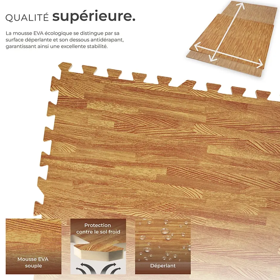 - Points Forts:Protège vos sols des rayures. Dalles individuelles assemblable au sol au moyen de bordures dentelées. Hydrofuge (résistant à l’humidité). Isolant thermique. Isolant acoustique (Atténue le bruit). Surface rainurée antidérapante. Peut être ajusté selon vos besoins. Résistant. Nettoyage facile.