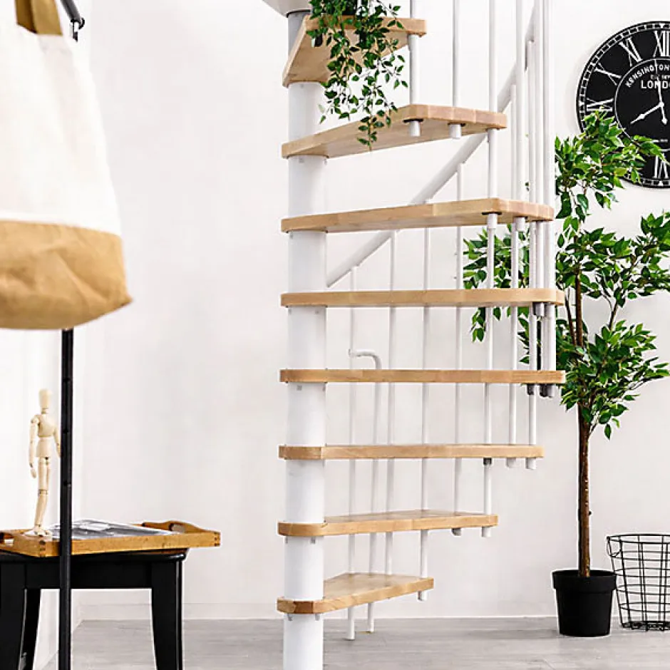 Escalier colimaçon 11 marches - Hauteur à franchir 2.09 à 2.59m - Diamètre 120cm - Structure blanche et marche hêtre --Matisere Online