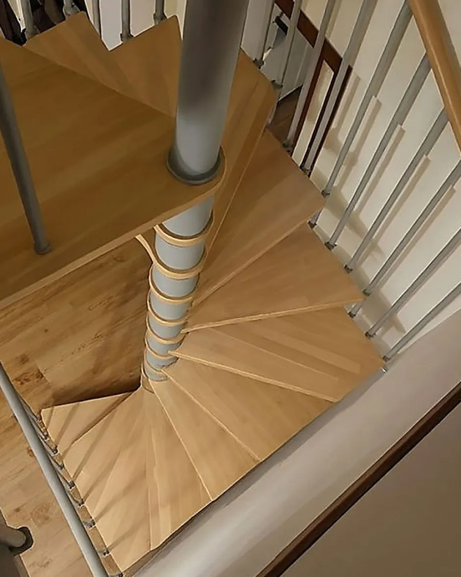 Escalier colimaçon 14 marches – Haut. à franchir 2.84m à 3.36m – Diam. 120cm – Trémie carrée – Struct. grise / marches naturel –Matisere