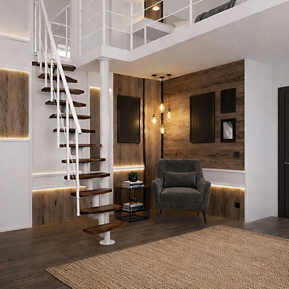 ESCALIER DESIGN- L’escalier d’intérieur droit en bois et acier est une solution simple et design pour accéder à un étage ou une mezzanine- Le mélange du bois massif et de l’acier offre des contemporaine à votre intérieur.- Peut s’intégrer dans un duplex au style Loft ou dans une maison moderne.- Sa conception droite permet d’optimiser l’espace en réalisant un espace de rangement ou de décoration sous l’escalierESPACES REDUITS- Escalier d’intérieur d’une largeur de 0.60 mètres pour des habitations avec des espaces réduits.- Passer d’un étage à un autre ou un espace en hauteur comme dans des appartements parisiens qui ont une surface réduite.HAUTEUR REGLABLE- Régler la hauteur en faisant varier la hauteur de la fixation sur la structure au moment du montage.- Pour une configuration spécifique, n’hésitez pas à nous adresser vos côtes (hauteur sous plafond et épaisseur de dalle) et photos de l’emplacement de l’escalier.STRUCTURE ET RAMPE BLANCHE- Structure en acier peint par poudrage et rails inférieurs de la rampe en acier inoxydable.- La rampe garantit un accès sécurisé lors de la montée et de la descente.- Rampe avec des poteaux reliés entre eux par 3 lisses rigidesMARCHES COULEUR NOYER- Marches en bois de hêtre avec une finition laqué, couleur noyer.- Designe des marches qui permet un gain de place au sol.MAIN-COURANTE PVC- Main-courante en PVC- Garantie un accès sécurisé lors de la montée et de la descenteINSTALLATION FLEXIBLE- Escalier qui peut se ligne droite ou en le tournant légèrement vers la gauche ou la droite.- Choix d’installation lors du montage.- Permet d’éviter un obstacle : mur, meuble, ouverture de porte…TREMIE- Trémie minimum requise : 125 x 65cm- La hauteur de passage entre l’escalier et le plafond doit être au minimum de 220 cm, pour un passage