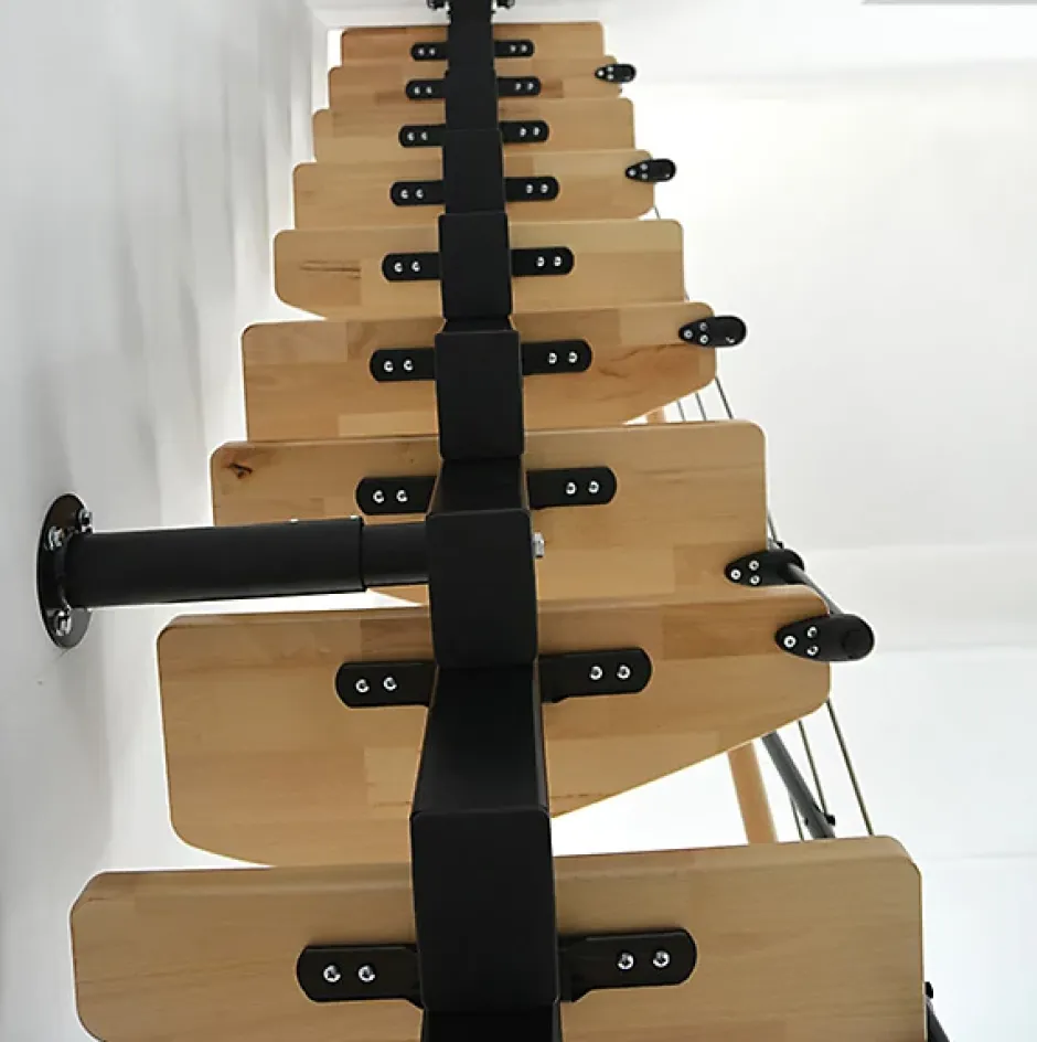 ESCALIER DESIGN- L’escalier d’intérieur droit en bois et acier est une solution simple et design pour accéder à un étage ou une mezzanine- Le mélange du bois massif et de l’acier offre des contemporaine à votre intérieur.- Peut s’intégrer dans un duplex au style Loft ou dans une maison moderne.- Sa conception droite permet d’optimiser l’espace en réalisant un espace de rangement ou de décoration sous l’escalierESPACES REDUITS- Escalier d’intérieur d’une largeur de 0.60 mètres pour des habitations avec des espaces réduits.- Passer d’un étage à un autre ou un espace en hauteur comme dans des appartements parisiens qui ont une surface réduite.HAUTEUR REGLABLE- Régler la hauteur en faisant varier la hauteur de la fixation sur la structure au moment du montage.- Pour une configuration spécifique, n’hésitez pas à nous adresser vos côtes (hauteur sous plafond et épaisseur de dalle) et photos de l’emplacement de l’escalier.STRUCTURE ET RAMPE NOIRE- Structure en acier peint par poudrage et rails inférieurs de la rampe en acier inoxydable.- La rampe garantit un accès sécurisé lors de la montée et de la descente.- Rampe avec des poteaux reliés entre eux par 3 lisses rigidesMARCHES ET MAIN-COURANTE HÊTRE- Marches en bois de hêtre avec une finition laqué.- Designe des marches qui permet un gain de place au sol.- Main-courante en hêtre qui garantit un accès sécurisé lors de la montée et de la descenteTREMIE- Trémie minimum requise : 130 x 65cm- La hauteur de passage entre l’escalier et le plafond doit être au minimum de 220 cm, pour un passage libre confortable.CHARGE ADMISSIBLE- Charge admissible par marche : 200kg- Charge admissible total : 800kgMONTAGE FACILE- La rampe peut être installée à droite ou à gauche selon votre convenance- 2 personnes minimum conseillées.-