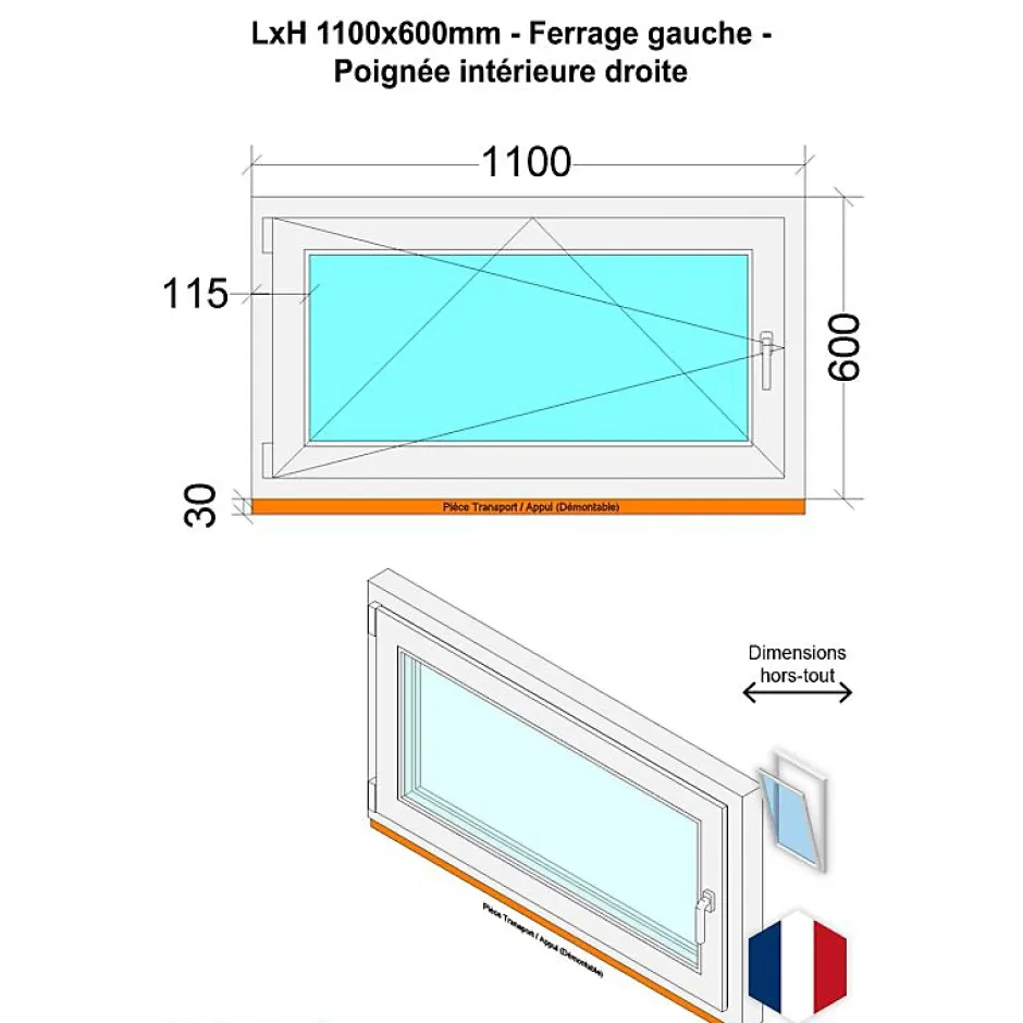 Fenêtre PVC – LxH 1100×600 mm -Triple Vitrage – Blanc -poignée à droite-Hexa’Fen Clearance
