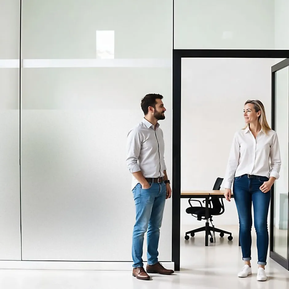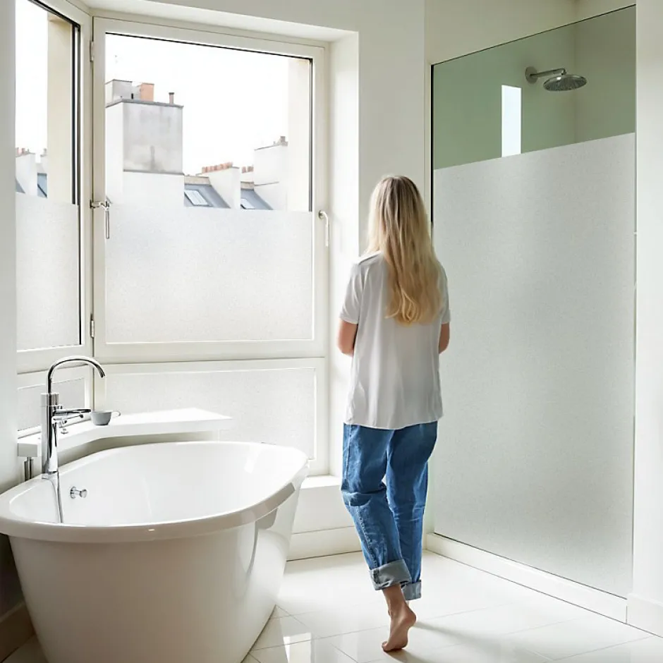 - Film dépoli pour vitrage – Idéal pour lutter contre le vis-à-vis et permet de cacher des regards indiscrets, tout en laissant passer la lumière.