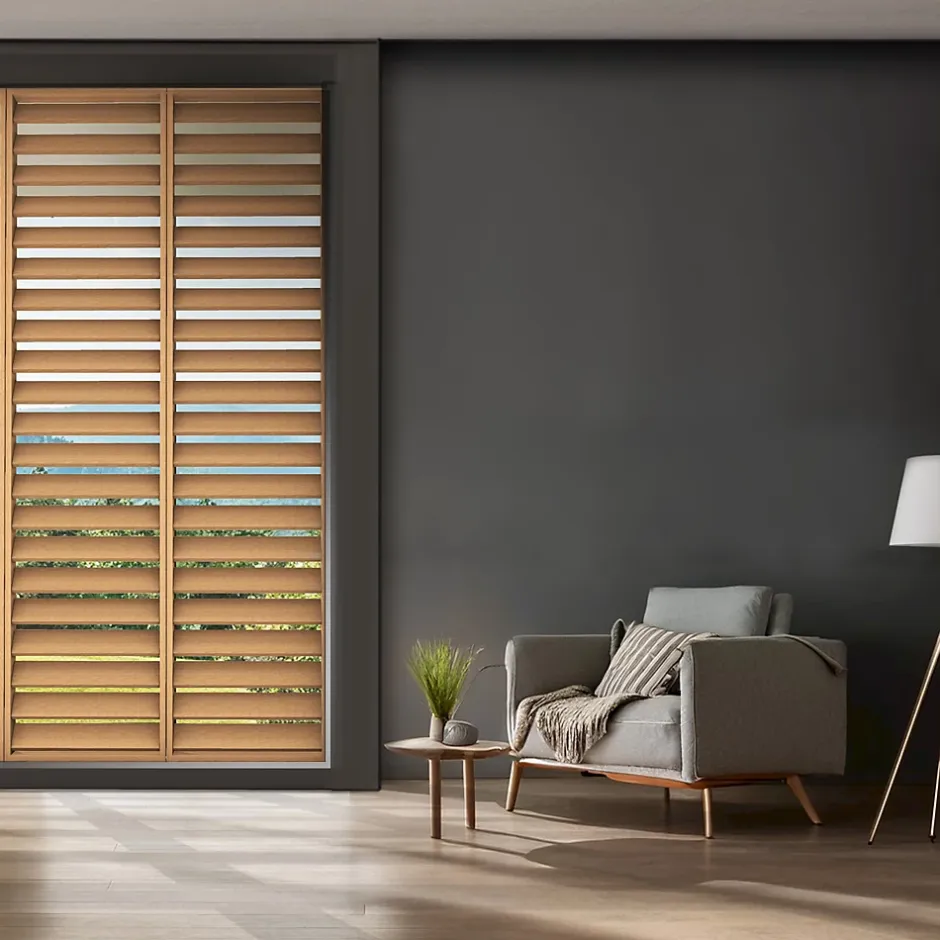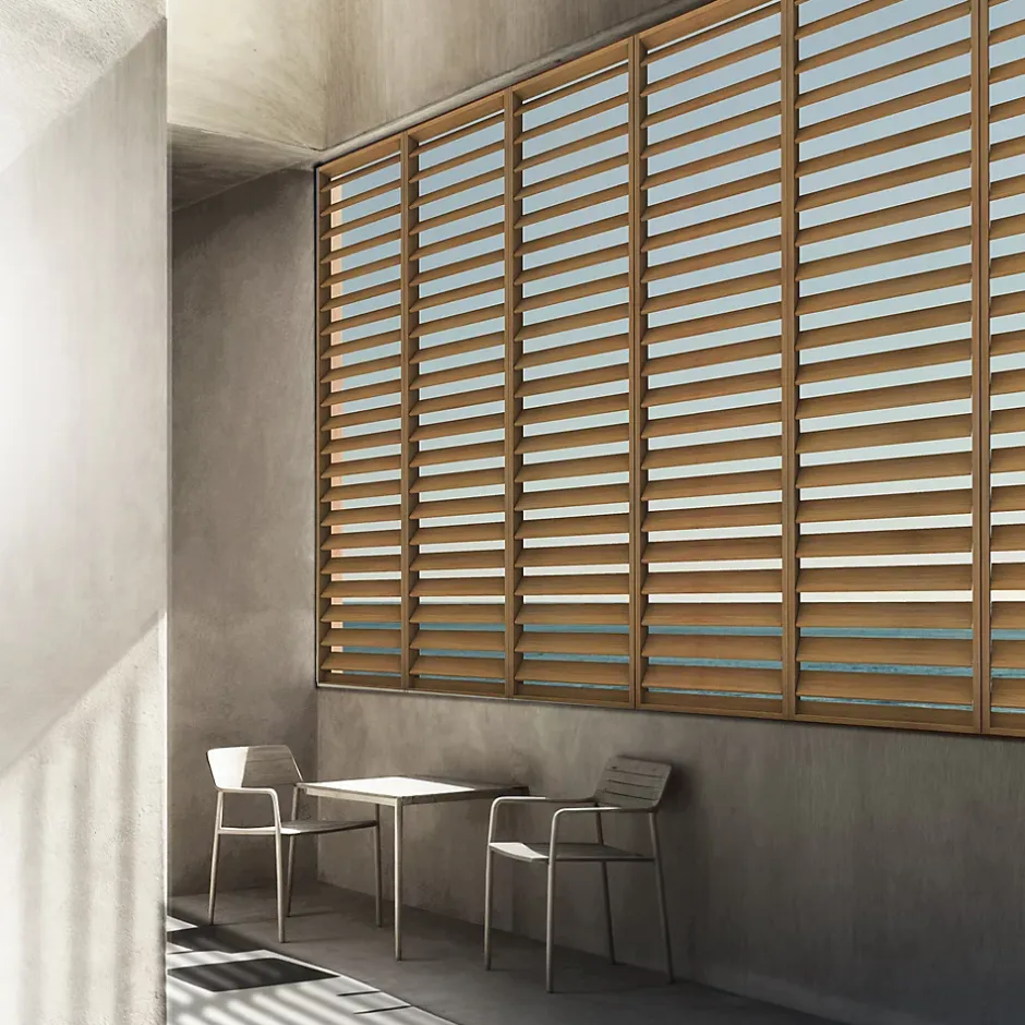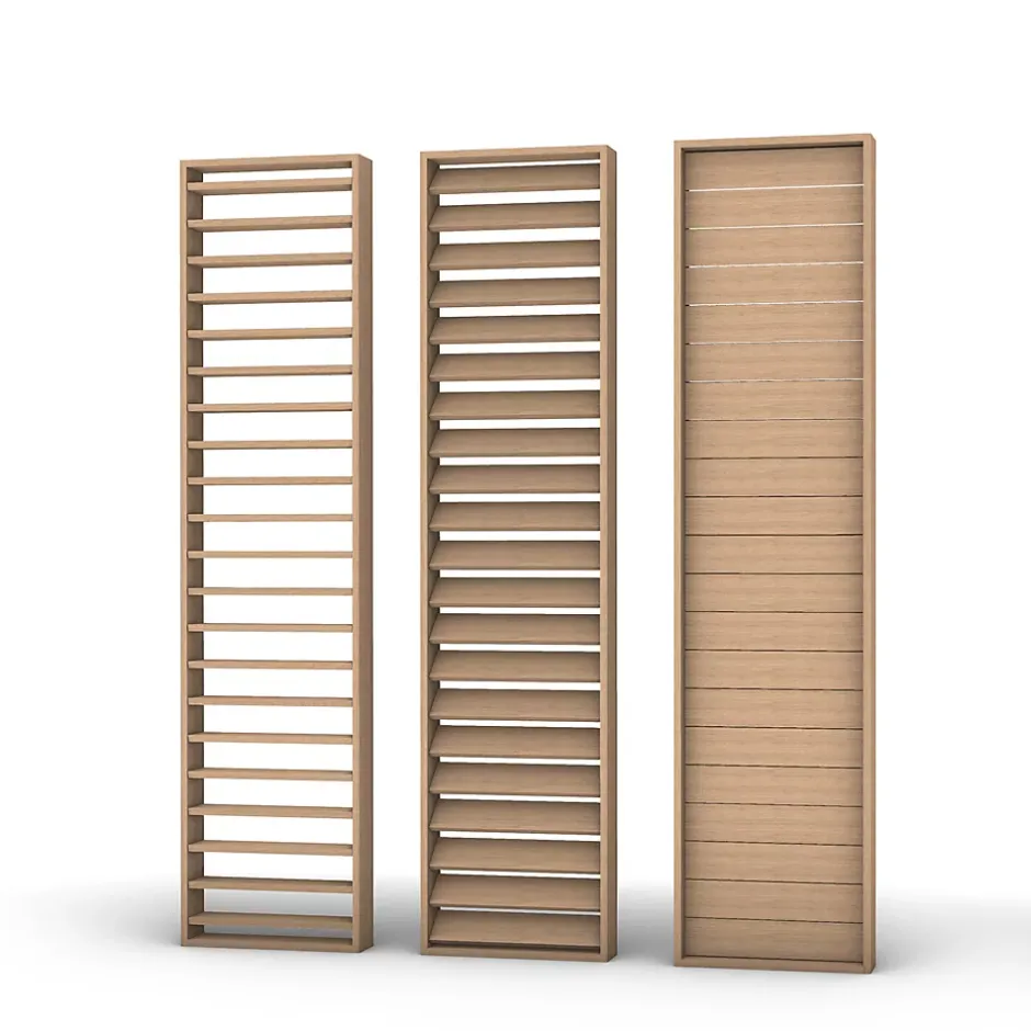 Panneaux persiennés à lamelles réglables permettant de diviser l’intérieur d’une pièce de manière esthétique et moderne, en permettant de couper visuellement ou de fermer complètement l’espace.