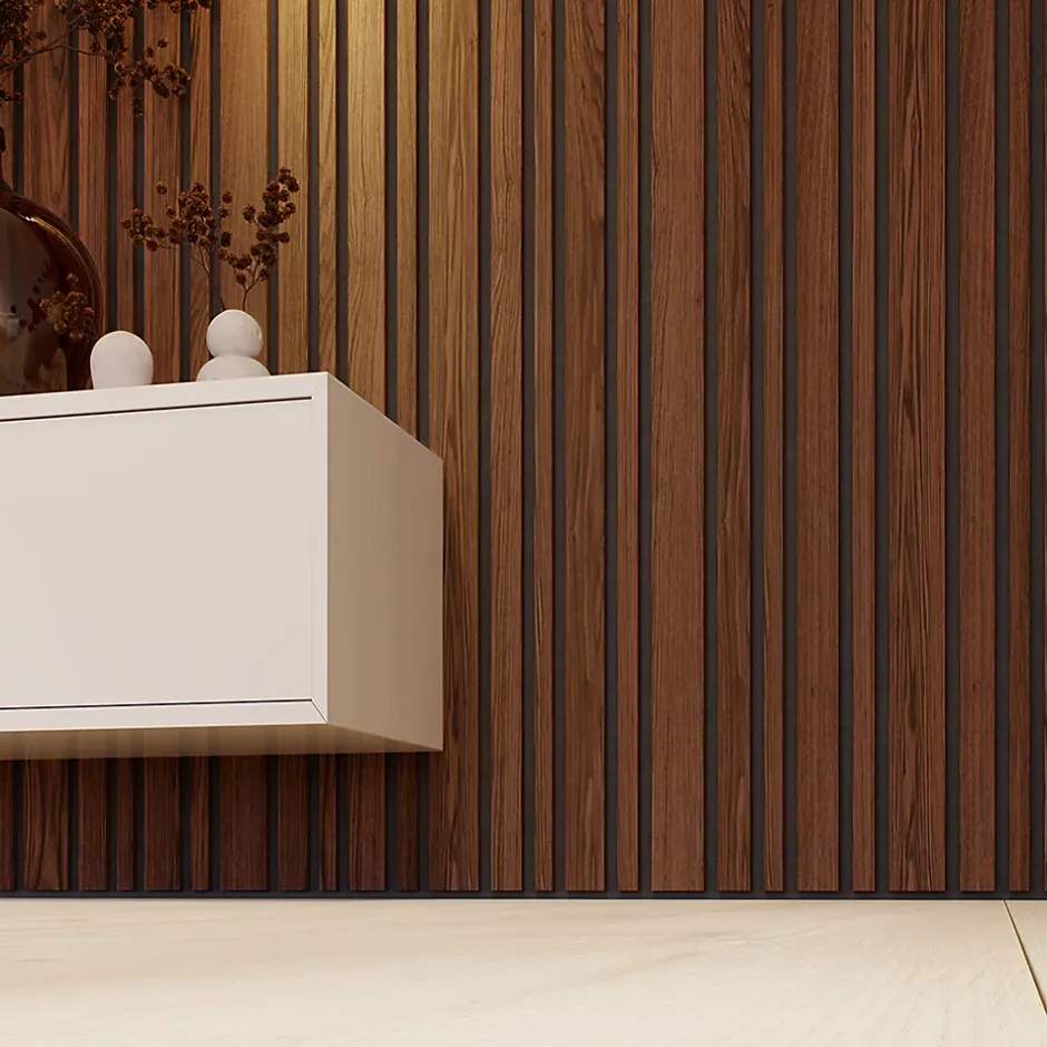 Lot de 2 panneaux tasseaux acoustiques – MDF sur feutrine acoustiqueDimensions (unité) : 2600 x 300 x 17 mm – 0,78 m² par panneau (1,56 m² pour le lot)Épaisseur : 17 mm (lamelles 12 mm – feutrine 5 mm)Livraison : sur RDV au pied de l’immeublePose facile – Mur ou plafondUn habillage mural acoustique haut de gammeCe lot de 2 panneaux acoustiques en tasseaux MDF sur feutrine offre un rendu visuel moderne et raffiné, idéal pour tout type d’intérieur.Leur design déstructuré à lamelles dépareillées apporte du relief et du caractère à vos murs et plafonds tout en améliorant l’acoustique de la pièce.Esthétique et performance sonoreCes panneaux sont conçus pour réduire la résonance et améliorer le confort acoustique dans les pièces de vie, les bureaux ou les espaces professionnels.Leur style s’adapte aussi bien aux ambiances contemporaines, classiques, que scandinaves ou industrielles.Installation simple et rapidePose verticale ou horizontale, mur ou plafond. Fixation par colle ou vis. Facilement découpables à la scie ou au cutter pour s’adapter à toutes les configurations.Convient aux surfaces irrégulières. Profilés d’extrémité assortis disponibles pour une finition parfaite.Utilisation : panneau mural décoratif, plafond, habillage acoustique, lambris intérieurSurface couverte : 1,56 m² (lot de 2 panneaux)