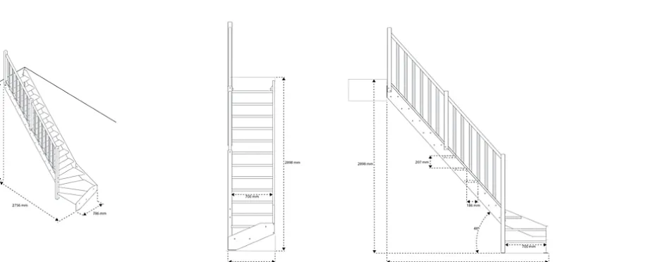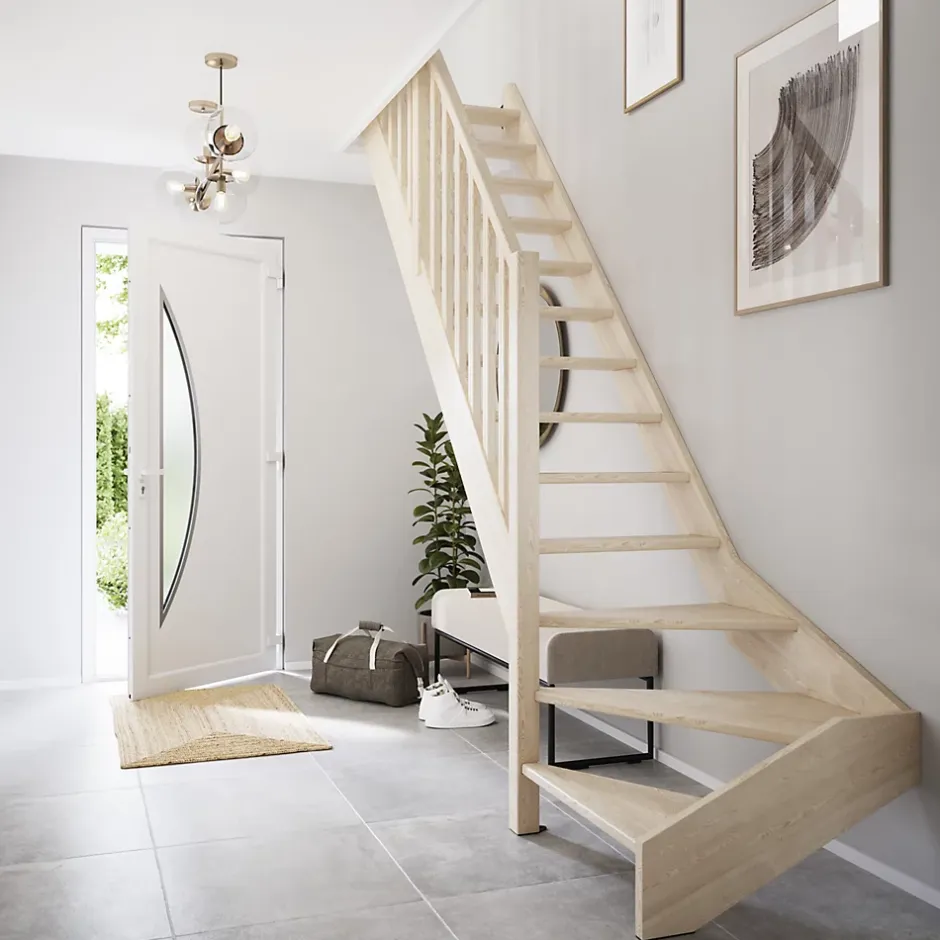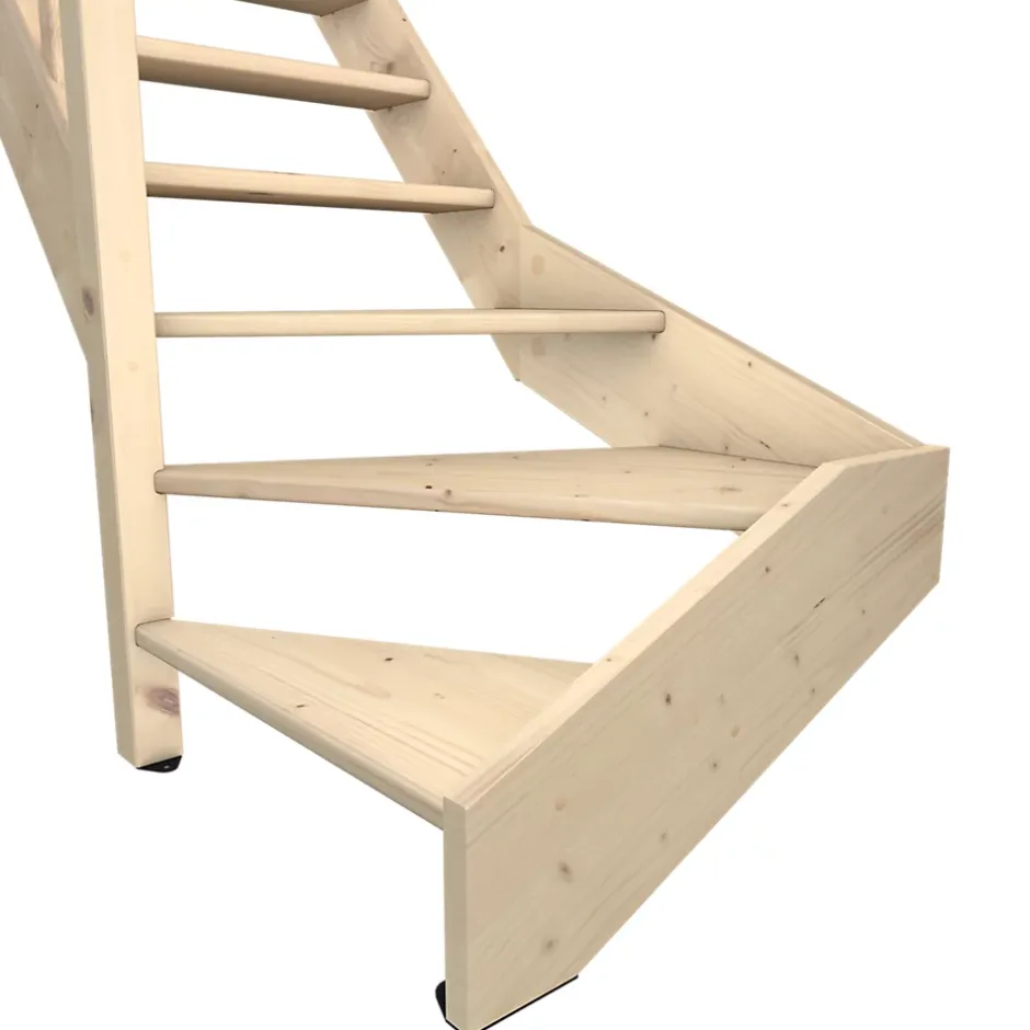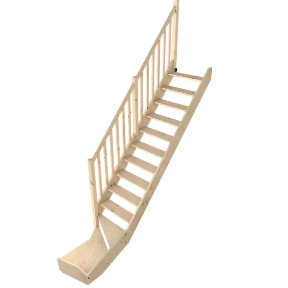 - Escalier quart tournant gauche avec 13 marches en épicéa naturel issu de forêts européennes certifiées.