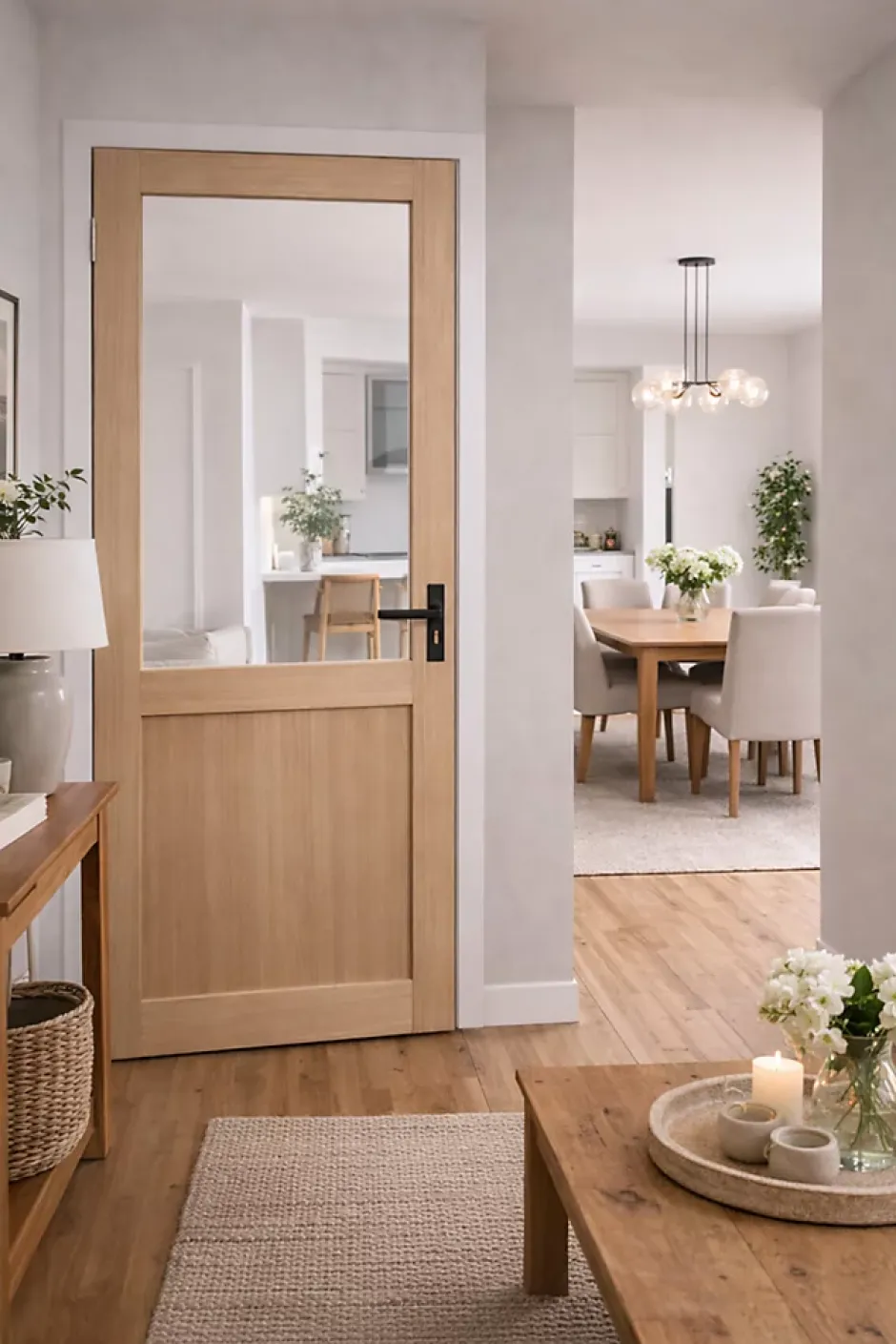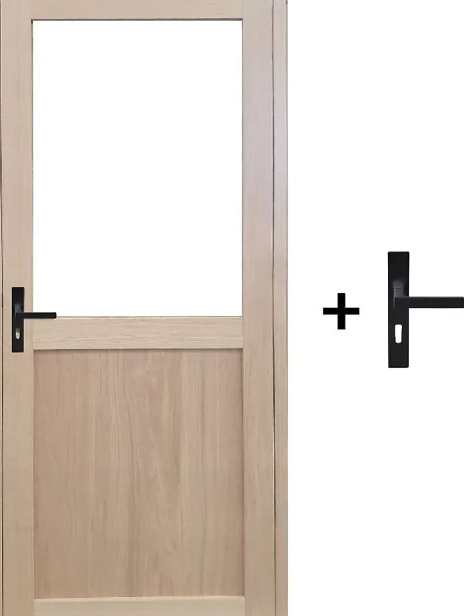 Bloc-porte Atelier Placage chene, vitrage transparentAuthenticite du bois et elegance contemporaineLe bloc-porte Atelier en placage chene vitre est une solution elegante et chaleureuse pour structurer vos espaces interieurs tout en conservant une belle luminosite. Realise en MDF avec placage chene et fabrique en France, il associe le charme naturel du bois a un design atelier intemporel.Avec une dimension cotes tableau de H 204 x L 83 cm et une dimension hors tout de H 210,2 x L 89,5 cm, ce bloc-porte est dote d’un ouvrant de 40 mm d’epaisseur, garantissant robustesse et stabilite. Les panneaux MDF plaques chene offrent un rendu authentique et une finition soignee.Il est equipe d’un vitrage transparent de 4 mm, favorisant la diffusion de la lumiere tout en structurant l’espace. L’ensemble est monte sur une huisserie de 72 x 45 mm, assurant une installation fiable et durable.Livre pret a poser, le bloc-porte comprend une serrure a cle et une gache posees, ainsi qu’un joint d’isolation isophonique pour un confort acoustique optimal.Sens d’ouverture : poussant droitePoignee inclusConçu exclusivement pour un usage interieur, ce bloc-porte doit imperativement etre installe dans un espace chauffe et isole, afin de garantir sa durabilite et ses performances.
