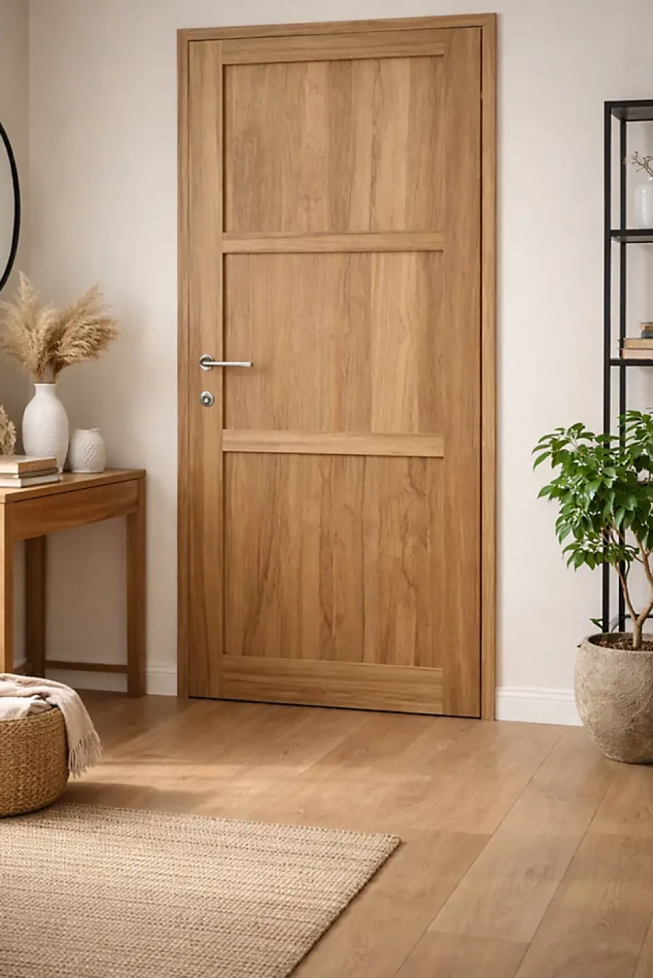 Bloc-porte Frake 3 panneauxCaractere du bois et design contemporainLe bloc-porte Frake 3 panneaux est une solution elegante et chaleureuse pour structurer vos espaces interieurs. Realise en MDF avec placage Frake et fabrique en France, il se distingue par son veinage expressif et son esthetique contemporaine.Avec une dimension cotes tableau de H 204 x L 73 cm et une dimension hors tout de H 210,2 x L 79,5 cm, ce bloc-porte est dote d’un ouvrant de 40 mm d’epaisseur, garantissant robustesse et stabilite. Les panneaux MDF plaques Frake offrent un rendu naturel et une finition soignee.La porte est composee de trois panneaux MDF, creant un design structure et elegant. Elle est montee sur une huisserie de 72 x 45 mm, assurant une installation fiable et durable.Livre pret a poser, le bloc-porte comprend une serrure a cle et une gache posees, ainsi qu’un joint d’isolation isophonique pour un confort acoustique optimal.Sens d’ouverture : poussant droitePoignee inclusConçu exclusivement pour un usage interieur, ce bloc-porte doit imperativement etre installe dans un espace chauffe et isole, afin de garantir sa durabilite et ses performances.