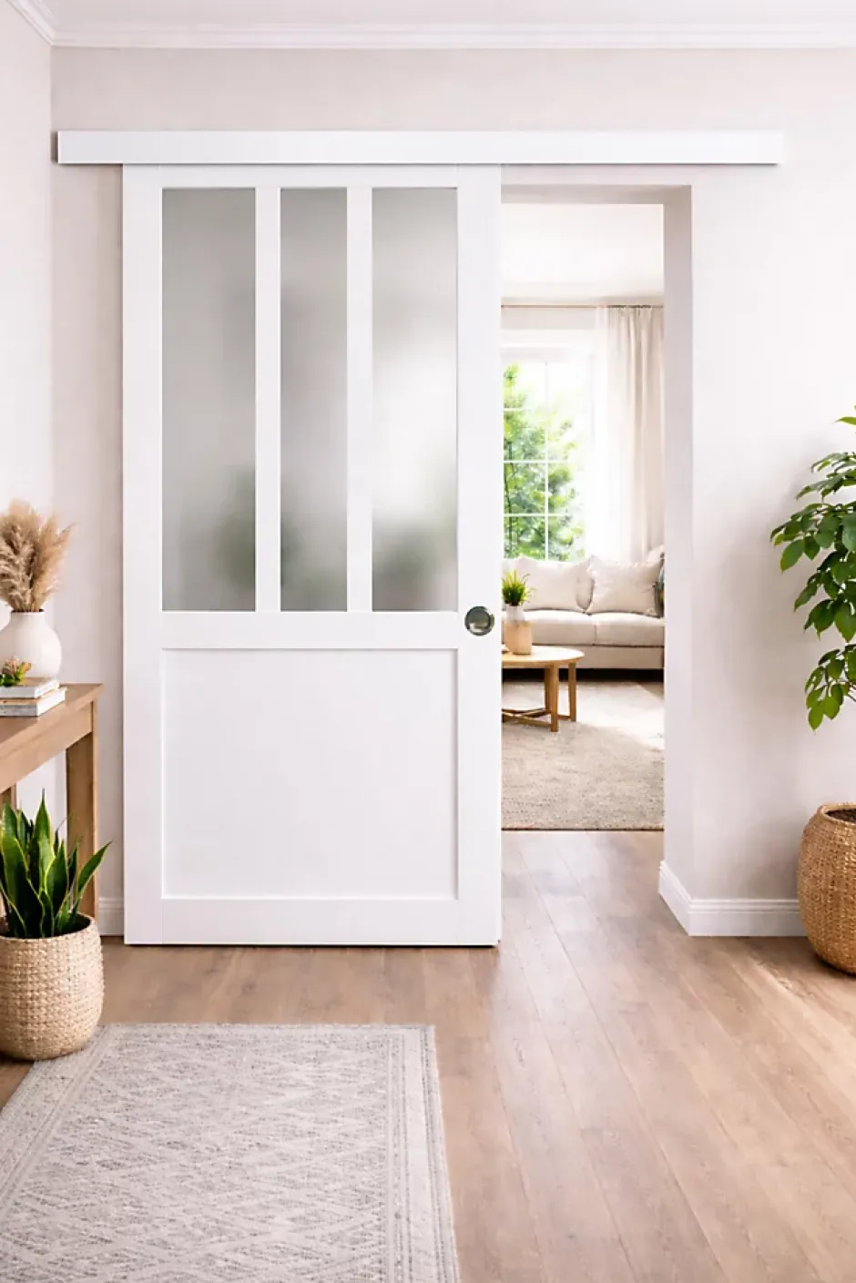 Porte Coulissante Atelier Blanc vitre depoli H204 x l73 + Rail alu Bandeau Blanc et CoquillesLa porte coulissante Atelier blanche avec vitrage depoli est ideale pour structurer vos espaces interieurs tout en preservant la luminosite et l’intimite. Son vitrage depoli securit de 4 mm diffuse la lumiere sans transparence directe, parfait pour une salle de bain, un bureau ou une chambre.Fabriquee en France, cette porte est conçue en MDF enrobe blanc, offrant une finition soignee et contemporaine. L’ouvrant presente une epaisseur de 40 mm, garantissant une bonne rigidite et une excellente tenue dans le temps.La porte dispose d’un rainurage integre pour le guidage, permettant une ouverture coulissante fluide et silencieuse.Elle est livree avec un rail en aluminium avec bandeau blanc, apportant une touche industrielle elegante. Le rail mesure 190 cm, est recoupable et est fourni avec un cache rail en aluminium blanc.Deux coquilles, posees sur la porte, completent l’ensemble pour une prise en main discrete et elegante.Cette porte est destinee a une installation interieure uniquement, dans un espace chauffe et isole.