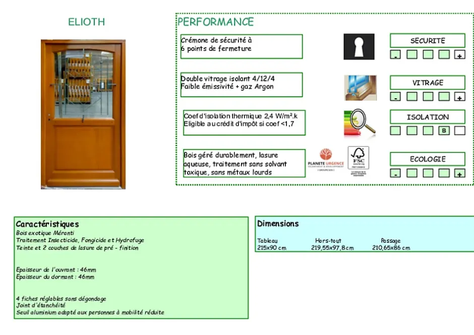Decouvrez notre porte d’entree en bois vitree modele Elioth, conçue avec un vitrage transparent pour allier luminosite et design moderne. Avec ses dimensions de H215 cm x l90 cm (219,5 x 97,8 cotes totale hors tout) et son ouverture poussant droit, cette porte est ideale pour une installation facile et pratique. Elle est equipee d’une poignee et d’un barillet de haute qualite, garantissant securite et confort d’utilisation. Reference produit : 010403FP.