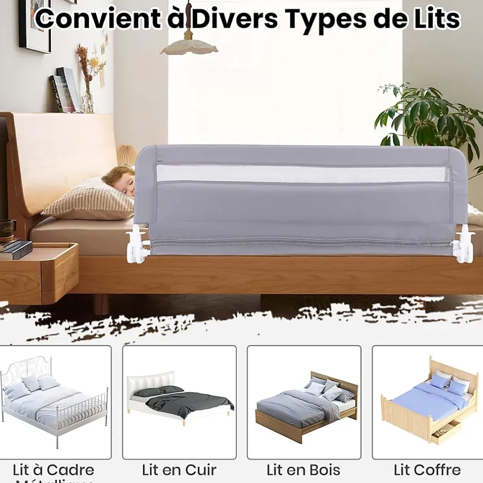 - Barrière de Lit Sûre et Sécurisée: Notre barrière de lit enfant utilise une structure en métal et ajoute une barre enveloppée dans une mousse antichoc douce pour protéger le bébé des impacts. De plus, sa conception en maille respirante et confortable vous permet de surveiller les mouvements de votre bébé.
