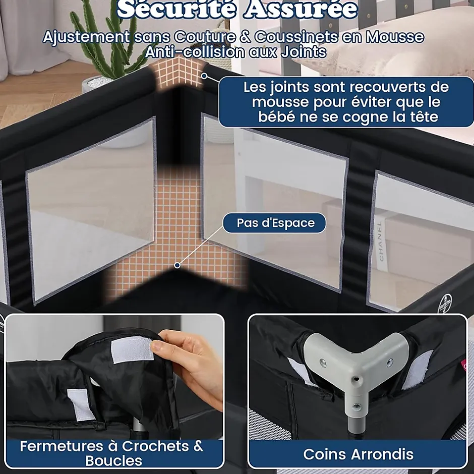 - Tous les joints supérieurs sont équipés de coussins en mousse anti-collision pour prévenir les blessures en amortissant l’impact si votre petit frappe sa tête. L’ajustement sans couture garantit qu’il n’y a pas de fentes susceptibles de pincer.