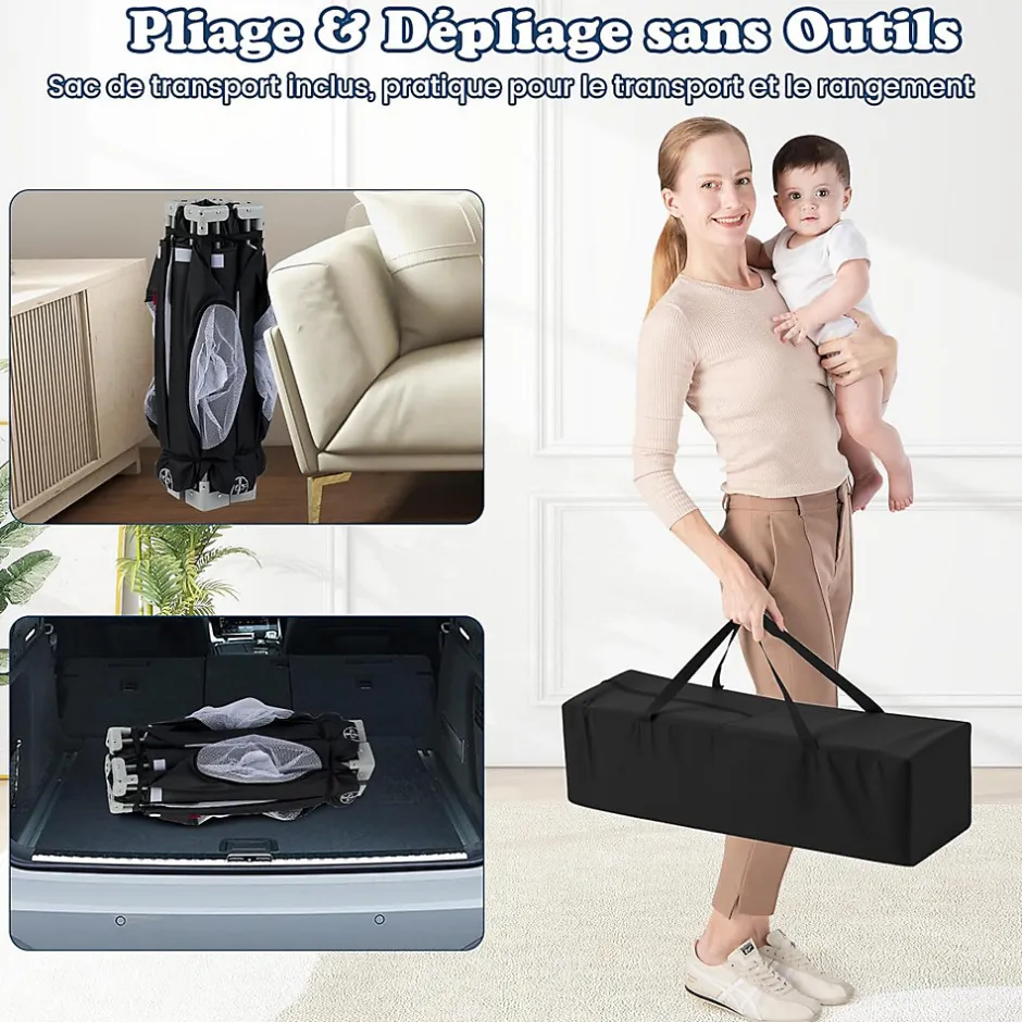 - Aucun assemblage n’est nécessaire. Le parc bebe peut être facilement déplié et plié. Le parc plié est compact et peut être rangé n’importe où dans la maison. Le design léger permet de le mettre dans le coffre et de le sortir facilement. Un sac de transport inclus facilite le transport et le stockage.