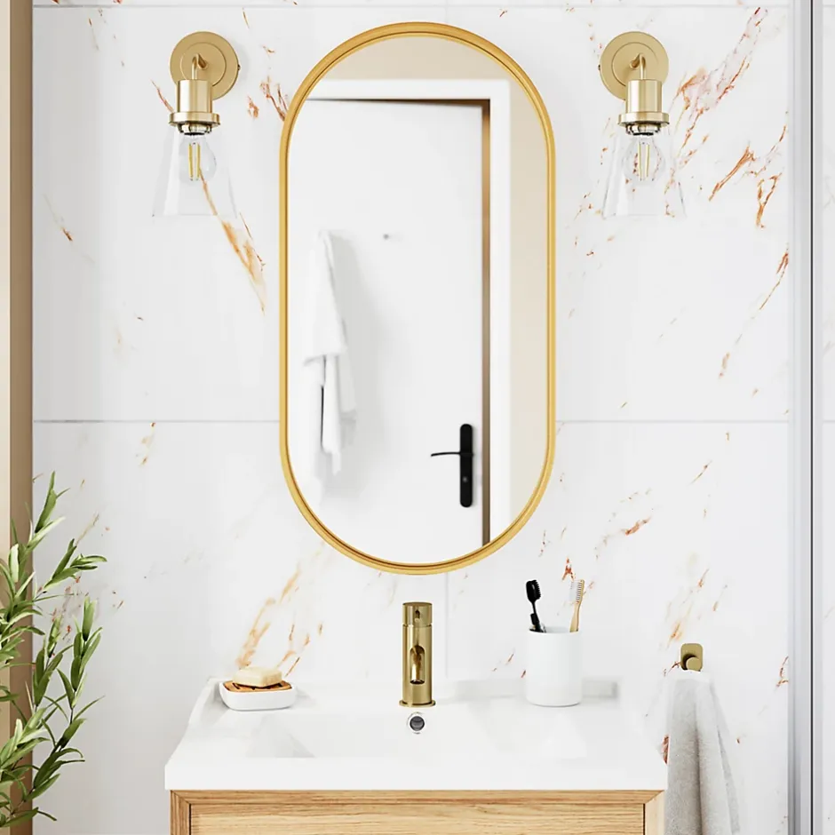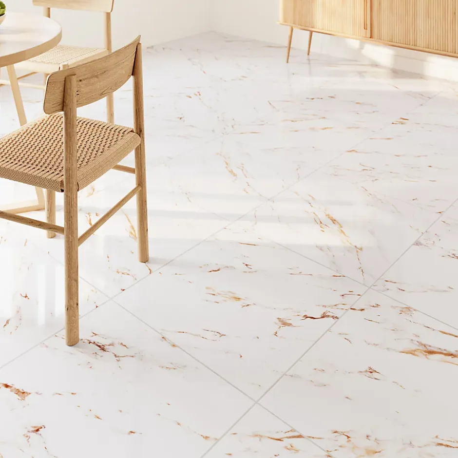 Le carrelage intérieur Goodhome effet marbre or brillant (608 mm x 608 mm) apporte luxe et élégance à vos murs et sols, secs ou humides, comme les cuisines et salles de bains. Ces carreaux émaillés non rectifiés offrent un effet marbre raffiné avec finition lisse et brillante. Associés aux plinthes Aruma, ils créent un ensemble cohérent et élégant dans vos espaces intérieurs. Résistants aux rayures et aux taches, ces carreaux allient praticité, durabilité et style haut de gamme, offrant un rendu somptueux et contemporain pour des intérieurs sophistiqués et fonctionnels.