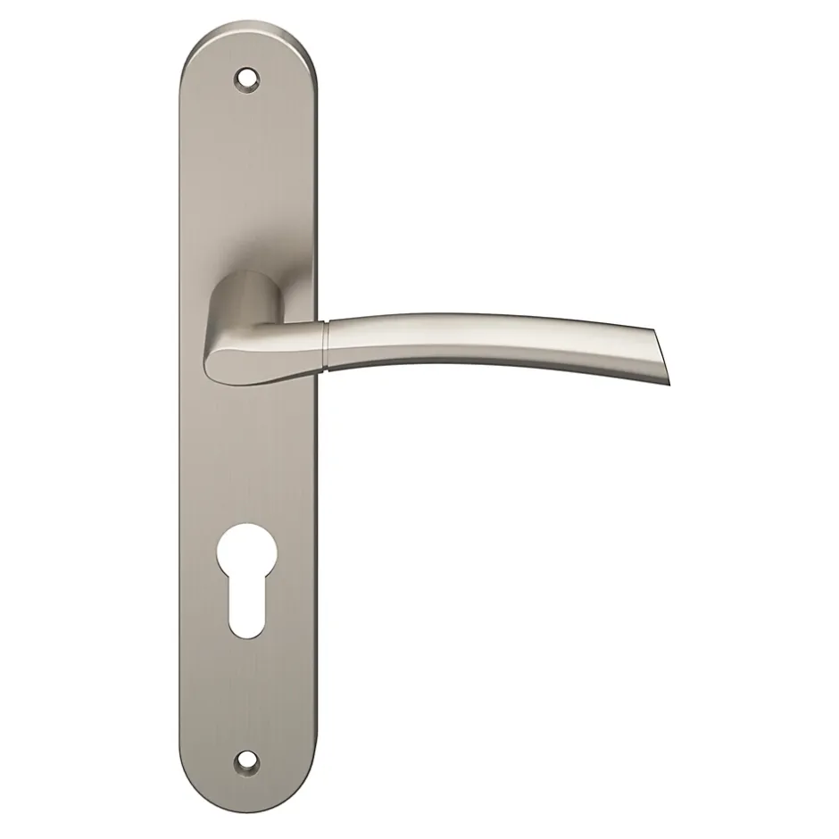 Ensemble poignée sur plaque extérieur rond cylindre GoodHome Hirel effet nickel satin gris chromé L.128mm x l.40mm entraxe 195mm