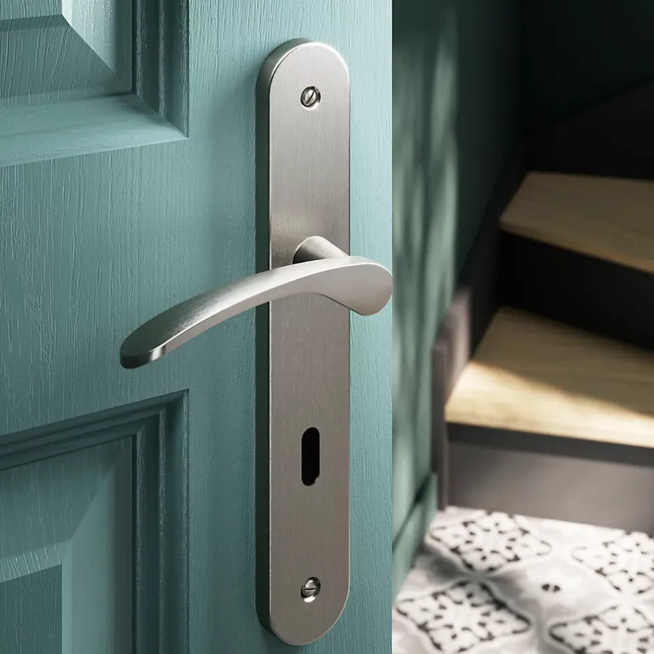Ensemble poignée sur plaque rond serrure GoodHome Beare effet nickel satin gris L.110.5mm x l.40mm entraxe 195mm