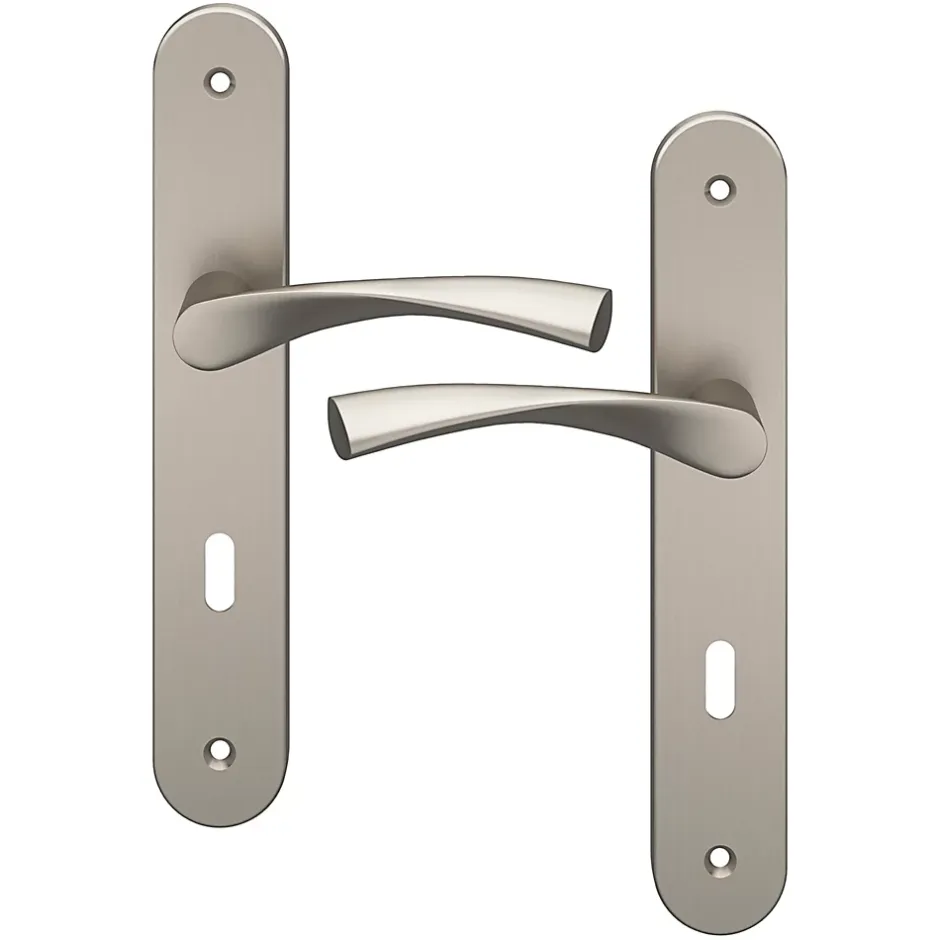 Ensemble poignée sur plaque rond serrure GoodHome Breage effet nickel satin gris L.120.5mm x l.40mm entraxe 195mm