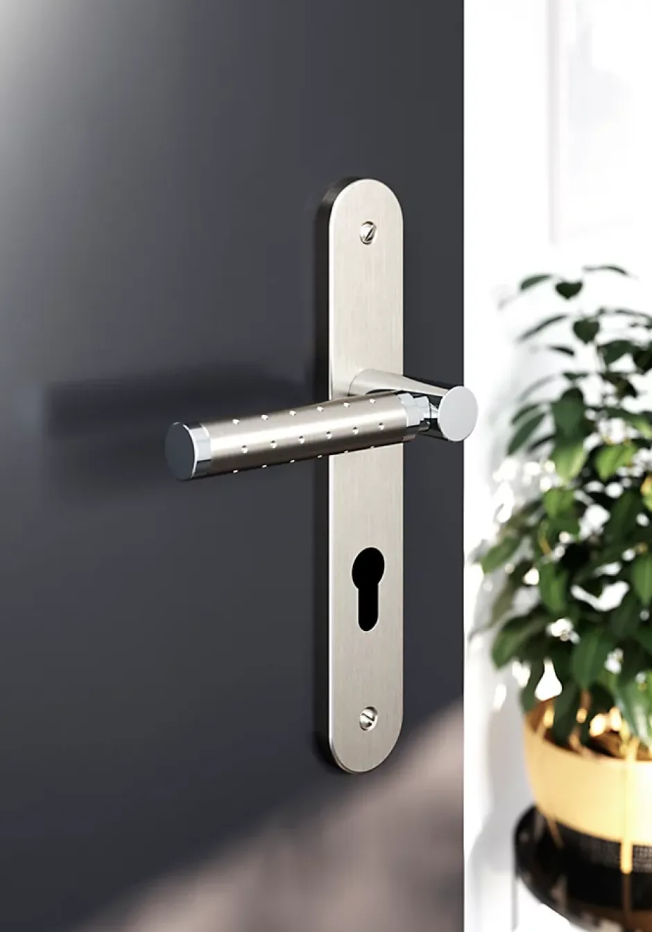 - Poignée de porte tendance sur plaque offrant une touche décorative à votre porte