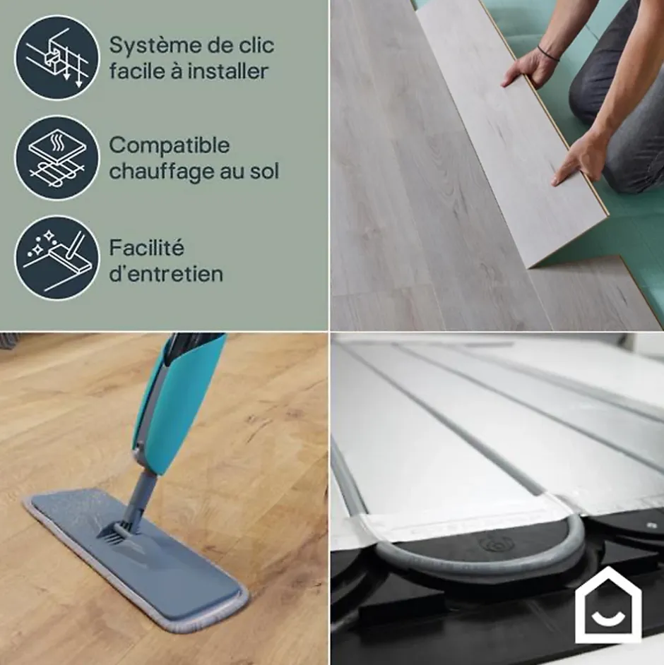 - Épaisseur 8 mm : stabilité, isolation et absorption des chocs pour un confort optimal, parfaitement adaptée à la rénovation