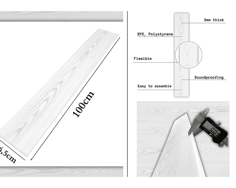 ✅ APPARENCE UNIQUE – Panneaux en polystyrène avec effet bois, marbre ou béton, apportant une touche moderne et élégante à votre intérieur. Parfait pour le salon, la chambre ou le bureau.✅ LÉGER & FLEXIBLE – Fabriqués en polystyrène extrudé (XPS), une mousse légère similaire au styropor, les panneaux sont ultra légers et faciles à installer. Dimensions : 100 x 16,7 cm, épaisseur : 3 mm.✅ INSTALLATION FACILE – Aucun outil spécial nécessaire ! L’installation se fait simplement avec de la colle de montage. Idéal pour transformer rapidement une pièce sans travaux lourds.✅ REMARQUES IMPORTANTES – Non adapté aux salles de bain ou cuisines, car sensible à la vapeur et à la chaleur. Garder une distance d’au moins 100 cm des flammes nues (cheminée, cuisinière à gaz) ou utiliser un verre de protection.✅ PROTECTION MURALE DÉCORATIVE – Ces panneaux offrent une isolation thermique et phonique minimale, et servent principalement à décorer les murs avec style. Les couleurs peuvent légèrement varier selon les réglages de l’écran.