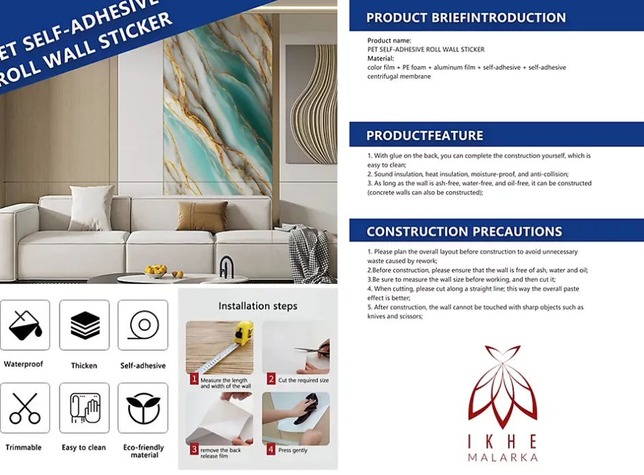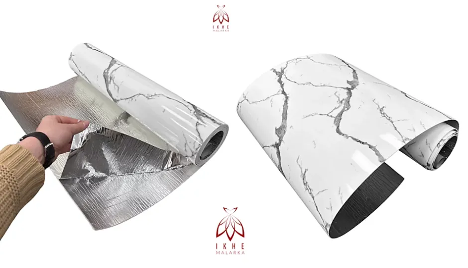 Film mural autocollant effet marbre PET – Rouleau 60 x 300 cmFilm mural autocollant en PET pour decoration murale interieure. Application possible sur surfaces lisses propres seches et planes. Convient aux murs peints meubles niches et surfaces decoratives. Usage interieur uniquement.Pose possible sur carrelage ceramique selon le support. Carrelage lisse et emaille : adhesion generalement suffisante. Carrelage structure poreuse surface irreguliere ou joints profonds : adhesion reduite possible. Dans ces cas l utilisation d une colle de montage adaptee est recommandee.Sur supports absorbants ou poreux tels que bois non traite MDF OSB panneaux de particules ou murs structures l utilisation d une colle de montage supplementaire est recommandee.Structure multicouche : surface PET couche imprimee effet marbre mousse PE feuille d aluminium et couche adhesive autocollante. Film flexible non rigide non panneau 3D epais. Resistant a l humidite surface lavable. Ne pas utiliser a proximite de sources de chaleur.Format rouleau 60 x 300 cm. Surface couverte 1 8 m2.
