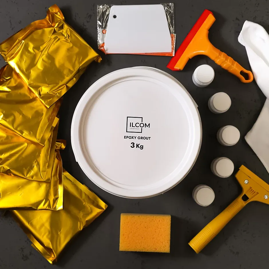 Fuite époxy universelle (mortier époxy) bicomposant pour le remplissage des fuites de 1 à 15 mm. UTILISATION: Pour la fuite des revêtements muraux et de sol, mosaïques, y compris les mosaïques en verre et pierres naturelles. Convient aux zones exposées à des acides, bases, huiles, solvants et eau sous haute pression. Recommandé pour les industries alimentaires et chimiques et les endroits avec des exigences hygiéniques élevées. Imperméable et haute résistance mécanique. MODE D’EMPLOI: Verser complètement le Composant B durcisseur dans le Composant A et mélanger soigneusement pendant au moins 3 min avec un mélangeur à bas régime jusqu’à obtenir une pâte homogène. Respecter strictement les proportions indiquées. Ne pas diluer la fuite avec de l’eau ou des solvants. Appliquer soigneusement le mortier dans les joints à l’aide d’une spatule spéciale en caoutchouc rigide pour les joints époxy. Enlever l’excès de mortier avec la même spatule en diagonale sur la surface des carreaux. Profiler immédiatement après avoir rempli avec le mortier. Nous recommandons d’éliminer l’excès de fuite dans les 15 minutes suivant l’application, en utilisant une éponge pour fuites époxy imbibée de solvant xylène, en effectuant des mouvements circulaires en éliminant l’excès restant sur la surface. Ensuite, avec une éponge ordinaire imbibé également de xylène, en enlevant l’émulsion grasse et finir de profiler la fuite. Rincer au moins 2 fois. Ne laissez pas durcir les résidus sur la surface céramique, leur élimination ne sera possible que mécaniquement. DONNÉES TECHNIQUES: Indiquées sur le manuel d’utilisation. CONSERVATION: Conserver dans un endroit sec et ombragé à des températures comprises entre 5 °C et 25 °C. Ne pas congeler ou surchauffer le produit. S’il est conservé dans les conditions indiquées et dans des emballages scellés, la durée de conservation est de 18 mois à compter de la date de fabrication indiquée sur l’emballage. Conforme à la norme PN-EN 13888:2010 comme RG.
