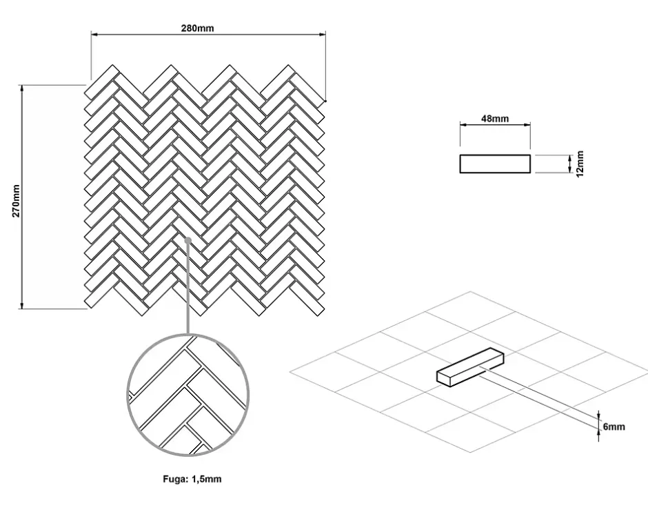 Mosaïque en céramique. Idéal pour une installation murale dans les espaces intérieurs de la maison, mais également excellent pour créer des bandes et/ou des inserts décoratifs car il est facile à couper grâce au maillage. Il s’adapte à toutes les surfaces, droites ou ondulées, également idéal pour les sols. La mosaïque est fournie sur un filet éco-plastique. Spécifications techniques : – Choix : Je ; – Antidérapant : non ; – Type de matériau : céramique (La découpe de la céramique est autorisée avec le disque céramique/carrelage.) ; – Dimensions de la plaque : 27cm x 28cm; – Taille de la carte : 4.8cm x 1.2cm; – Épaisseur : 6mm; – Quantité au m² : 14; – Résistant à l’eau ; – Résistant à la chaleur (convient aux saunas, spas et installation à proximité de sources de chaleur, par exemple poêles). Méthode d’installation :- Utilisez votre adhésif de montage spécifique préféré. – Appliquer le mastic époxy. – Laver l’excédent de mastic époxy avec une éponge douce et de l’eau. Traitement: La finition de surface permet un nettoyage facile avec un chiffon en microfibre, pour garantir la durabilité de la couleur dans le temps. Ne pas utiliser de produits abrasifs ou corrosifs. Ne pas frotter ni gratter. Élégance et facilité d’adaptation : La mosaïque en verre trempé se distingue par sa résistance à l’eau et à l’humidité, ce qui la rend parfaite pour une utilisation dans des environnements à forte humidité, tels que les salles de bains, les cuisines et les saunas. Il est idéal pour décorer les murs à côté des des baignoires et des douches. La finition en mosaïque s’intègre parfaitement aux designs modernes et minimalistes, ajoutant une touche d’élégance et de sophistication aux espaces.