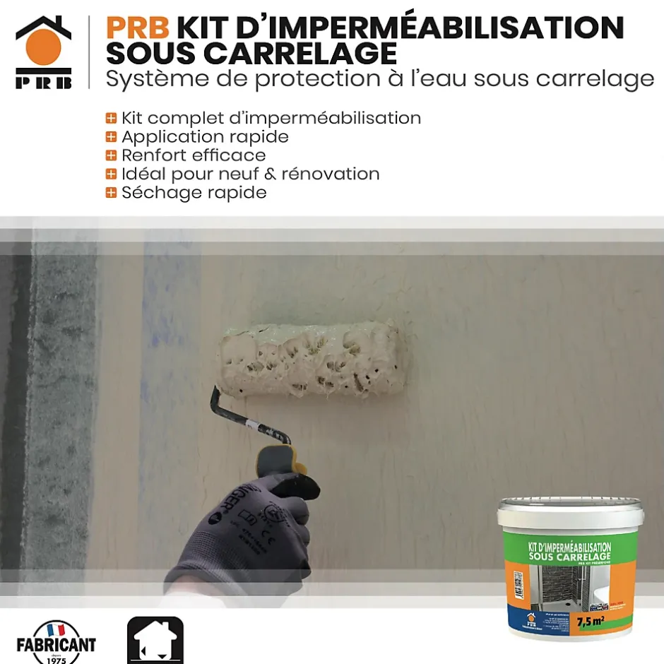 DESCRIPTION DU PRODUITKIT D’IMPERMÉABILISATION SOUS CARRELAGE – Ce kit complet pour l’étanchéité sous carrelage comprend un primaire d’accrochage de 1 kg, 6 kg de résine de protection et 10 mètres de bande d’armature renforcée SEBS. Fabriqué en France par PRB, fabricant français reconnu pour la qualité de ses produits techniques du bâtiment. Il est conçu pour offrir une étanchéité efficace sur vos supports carrelés, qu’il s’agisse de nouveaux travaux ou de rénovations. La résine se pose facilement, assurant une protection optimale contre l’humidité et l’eau. Ce kit permet une application rapide et garantit une protection durable.AVANTAGES DU PRODUITLe kit d’imperméabilisation sous carrelage PRB est idéal pour protéger vos surfaces carrelées des infiltrations d’eau. Avec un primaire d’accrochage et une résine de qualité, il assure une étanchéité renforcée. Sa bande d’armature SEBS offre un renfort supplémentaire, rendant le tout encore plus fiable et durable. Ce kit est pratique à utiliser pour tout projet de rénovation ou de neuf. La mise en œuvre est rapide, et le séchage est efficace pour un résultat optimal.CARACTÉRISTIQUES TECHNIQUES :- Utilisation : Protection étanchéité sous carrelage en neuf ou rénovation.- Composition : Primaire d’accrochage (1 kg), Résine de protection (6 kg), Bande d’armature SEBS (10 mètres).- Application : Système de protection étanche à l’eau sous carrelage.- Autres caractéristiques : Système simple et rapide d’application, séchage rapide, durable.