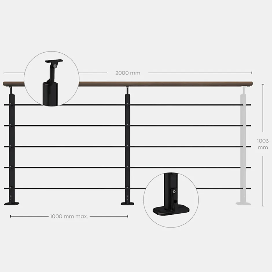 Le garde-corps Opalu est une solution prêt-à-poser, simple à installer, avec un design épuré. Ce garde-corps allie un aluminium noir profond (RAL 9005) à une main courante Kebony en pin radiata(certifié Certification bois), conçu pour une fixation à plat en extérieur ou intérieur.Opalu est disponible en 3 coloris avec 3 options de mains courantes (bois/aluminium) et en fixation à plat ou latérale.Ce kit permet d’installer 2 mètres linéaires de balustrade. Il est possible d’assembler plusieurs kits ensemble. Chaque élément est recoupable avec une scie à métaux pour s’adapter aux longueurs souhaitées. Pour finir votre ouvrage, un poteau supplémentaire de finition est à prévoir en supplément. Nous estimons le temps de pose à environ 1h par mètre linéaire. Dimensions kit complet : 78 x 1004 x 2000 mmDimensions poteau : 75 x 110 x 975 mmDimensions tubes : 10 x 10 x 2000 mmDimensions main courante : 35 x 70 x 2000 mm Composition du kit : 2 poteaux avec platines de fixation 1 main courante 2 mètres en Kebony (pin radiata) 5 tubes de remplissage avec assembleurs, capuchons de finition 2 goupilles élastiquesAccessoires complémentaires : 1 poteau de finition Panneaux de protection pour la mise en conformité à la norme de sécurité Pour les éventuels angles, prévoir des kits d’angle Visserie de fixation au sol non fournie à choisir selon la nature de votre solPour assurer la conformité aux normes de sécurité NF P 01-012 et NF P 01-013, il convient d’ajouter des panneaux de protection transparents à votre ouvrage si la hauteur de chute est supérieure à 1m. Pas obligatoire pour les montées d’escalier. Entraxe poteaux max 1000 mm.